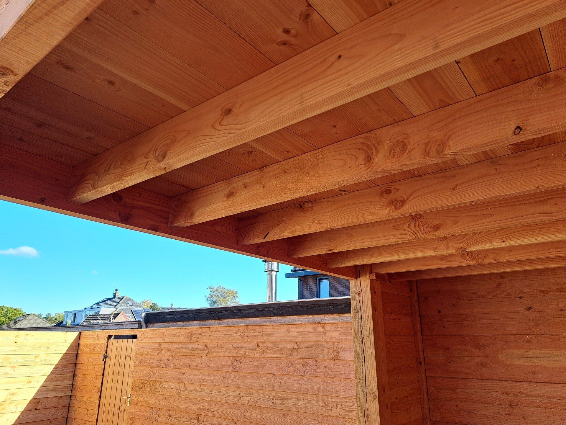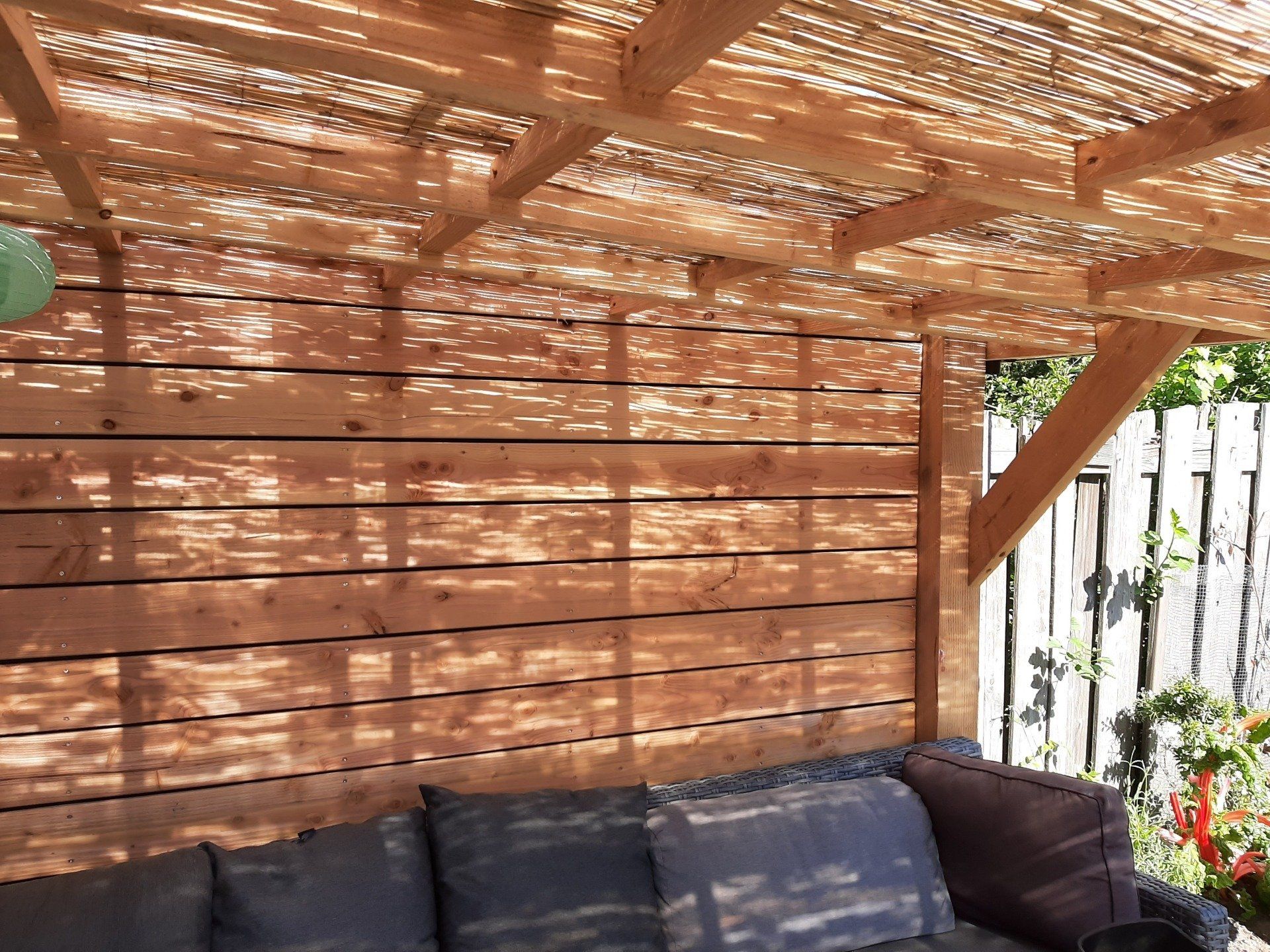 Overkapping in combinatie met een schutting, uitgevoerd in Douglas-hout.