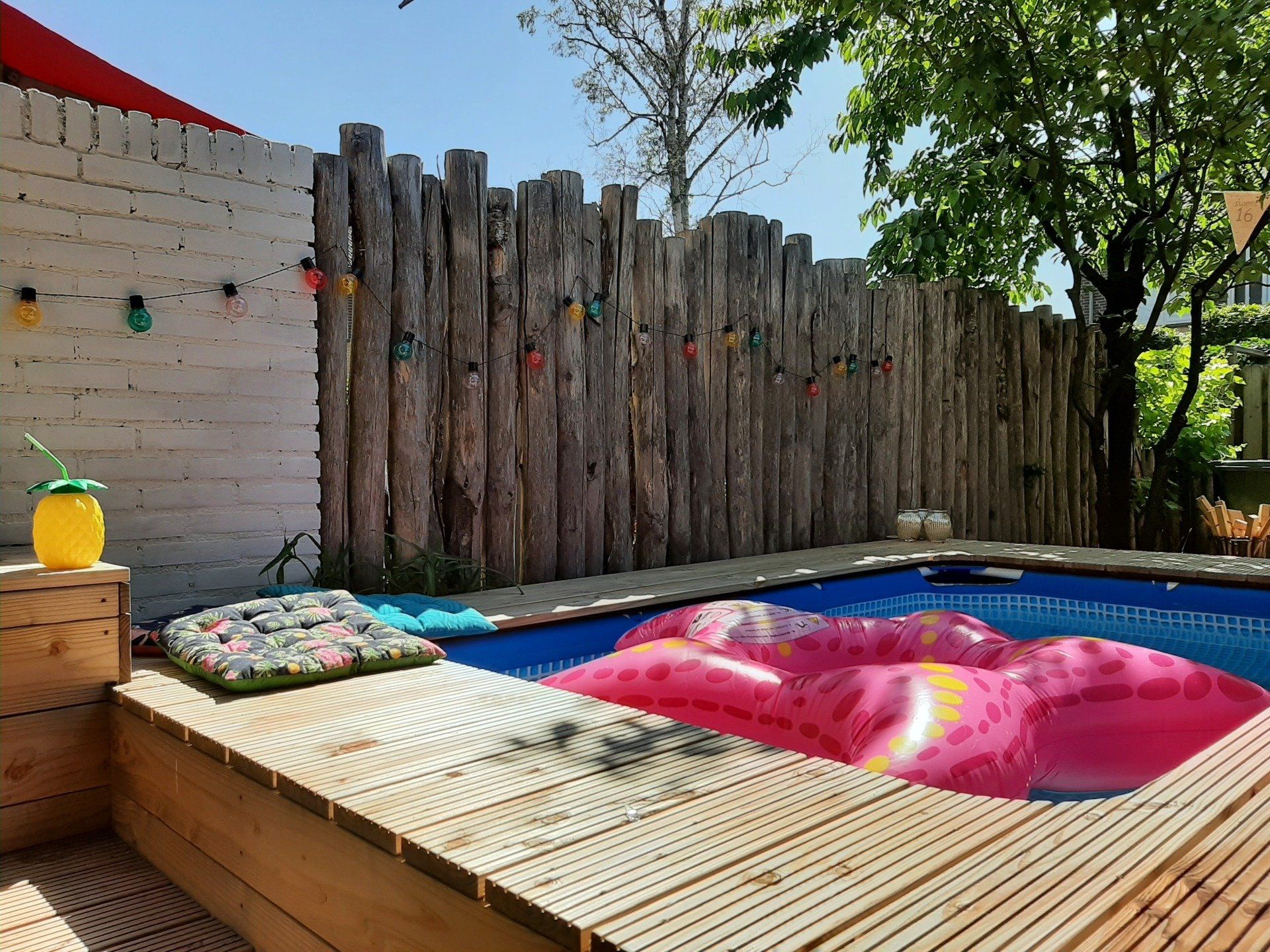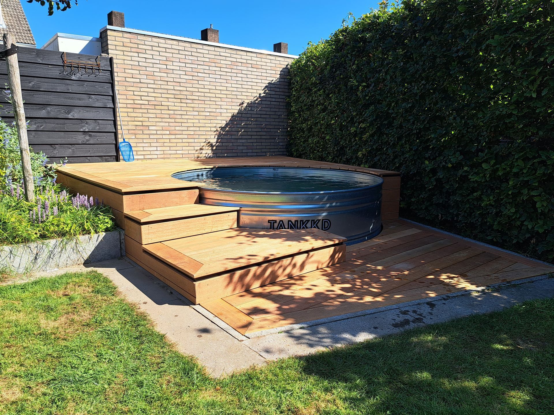 Hardhouten vlonder rondom ijzeren zwembad.