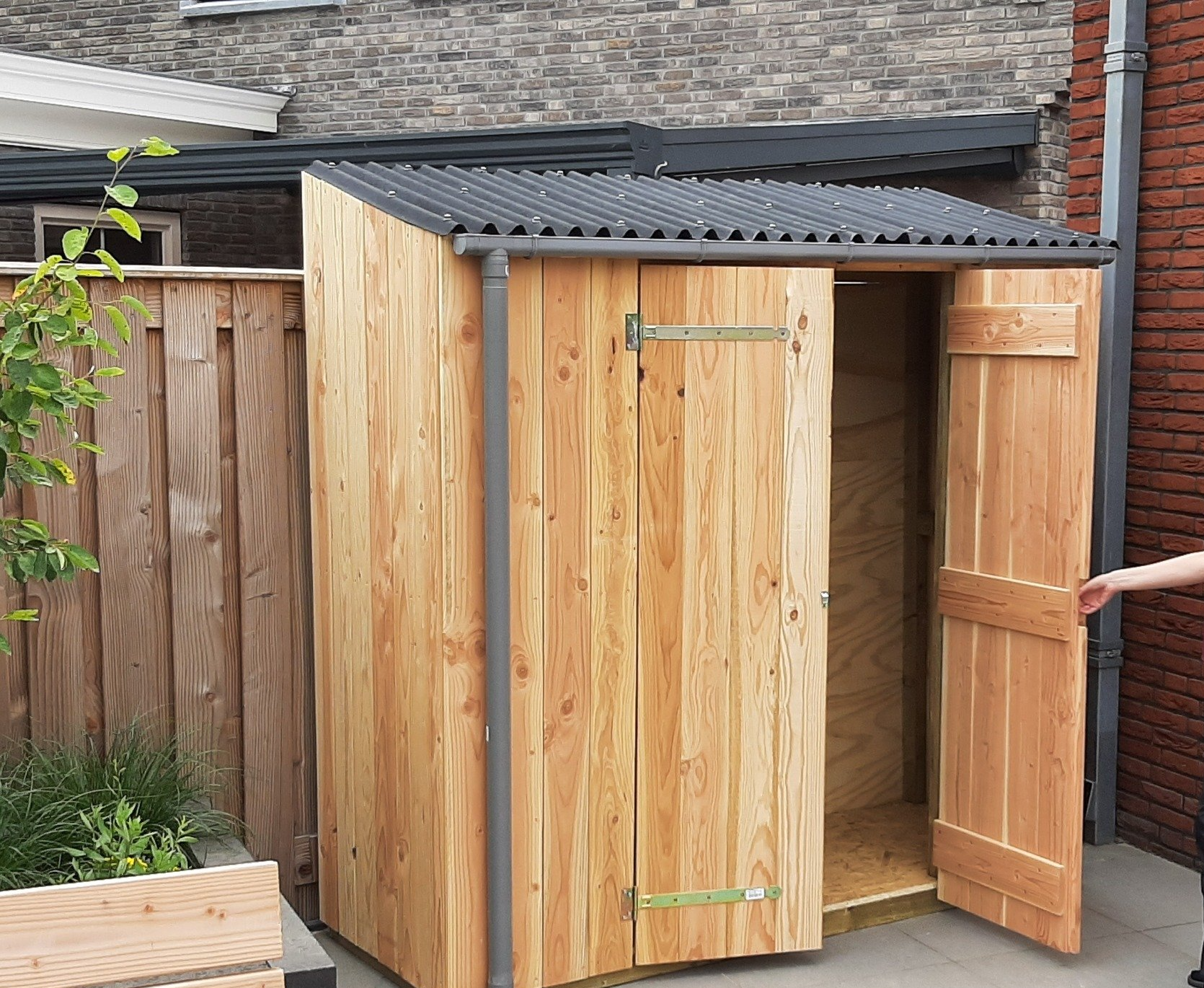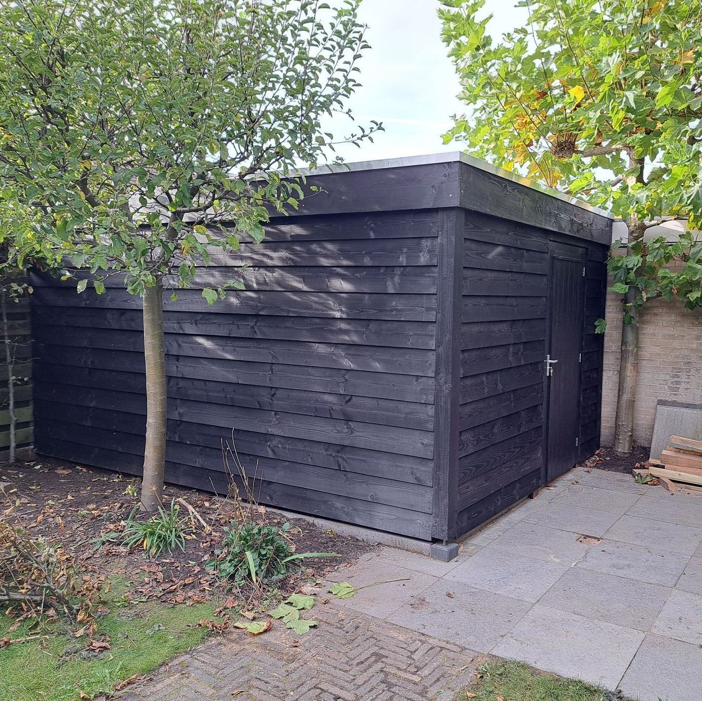 Tuinschuur die oude houten schuurtje vervangt en tevens een lelijke muur maskeert.