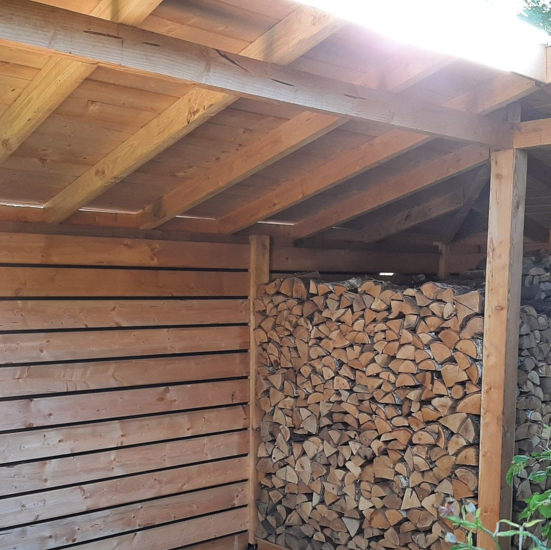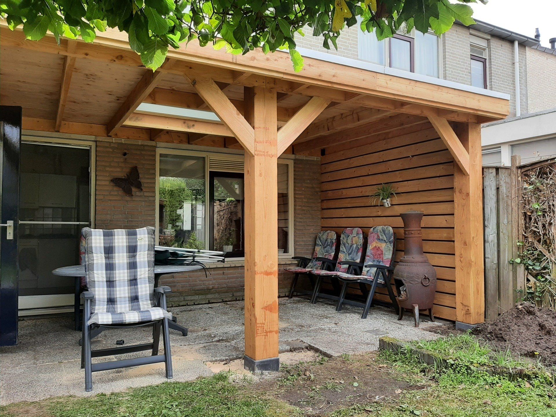 Mooie ruime overkapping met vaste shutter-wand en dakdoorvoer voor een houtkachel.