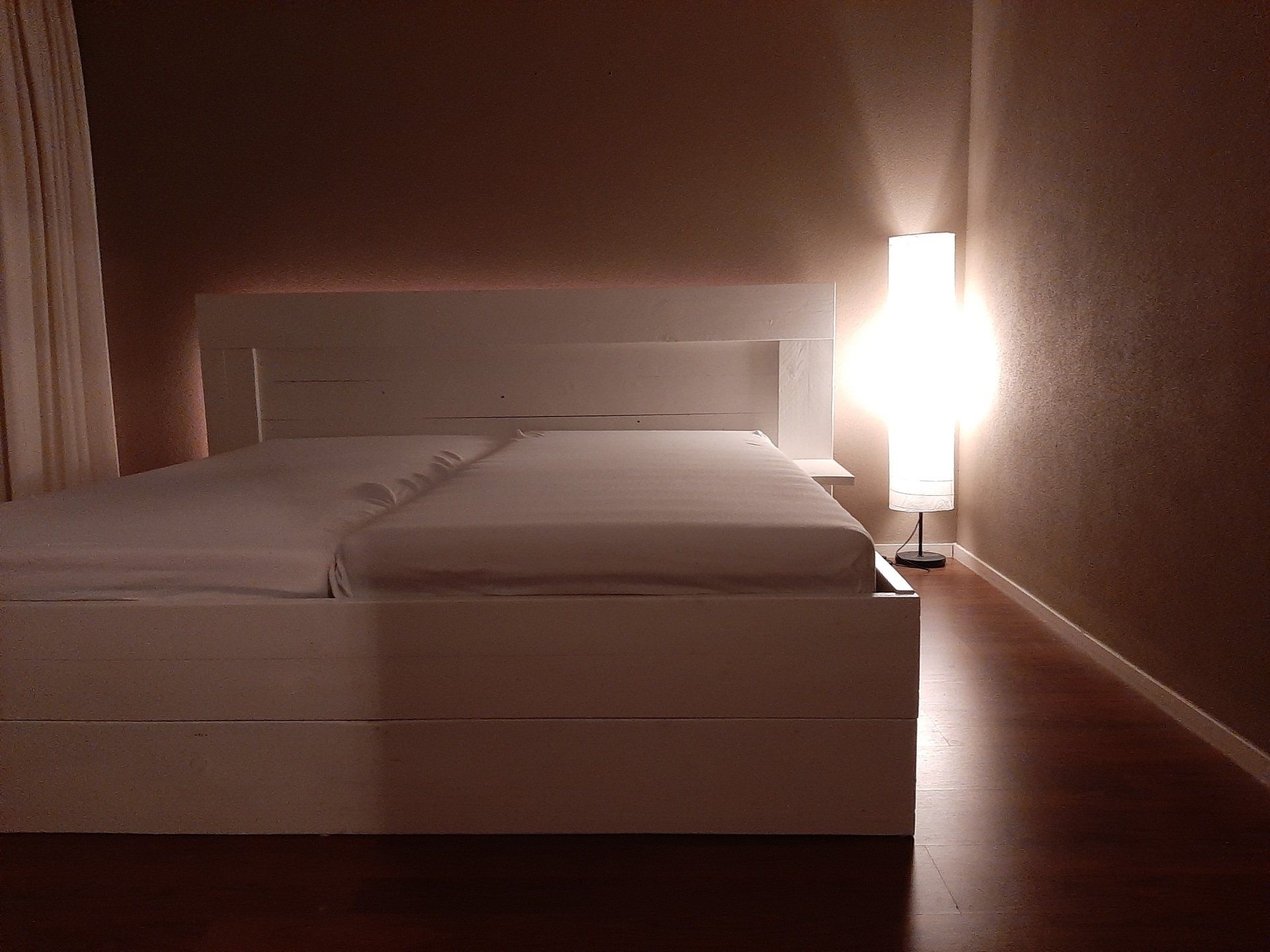 Tweepersoonsbed met LED verlichting achter hoofdbord.
