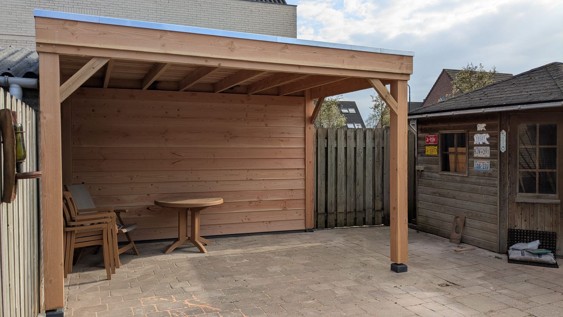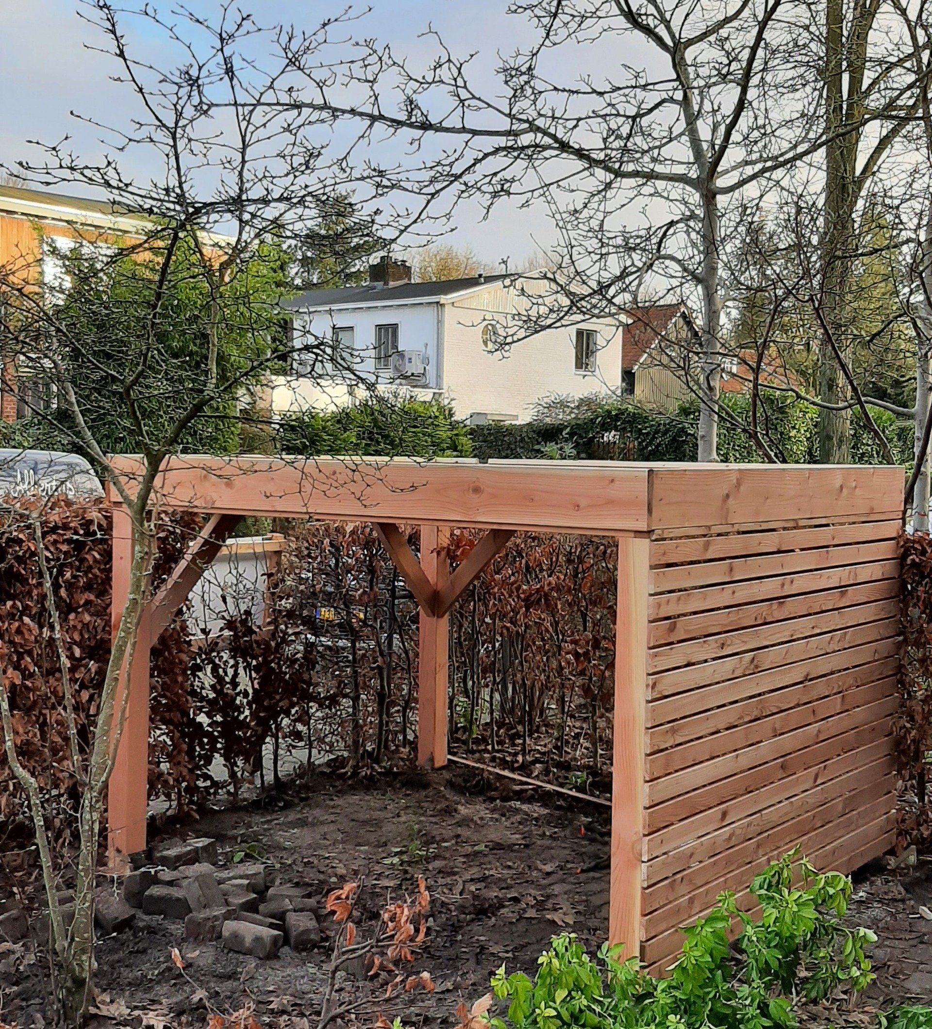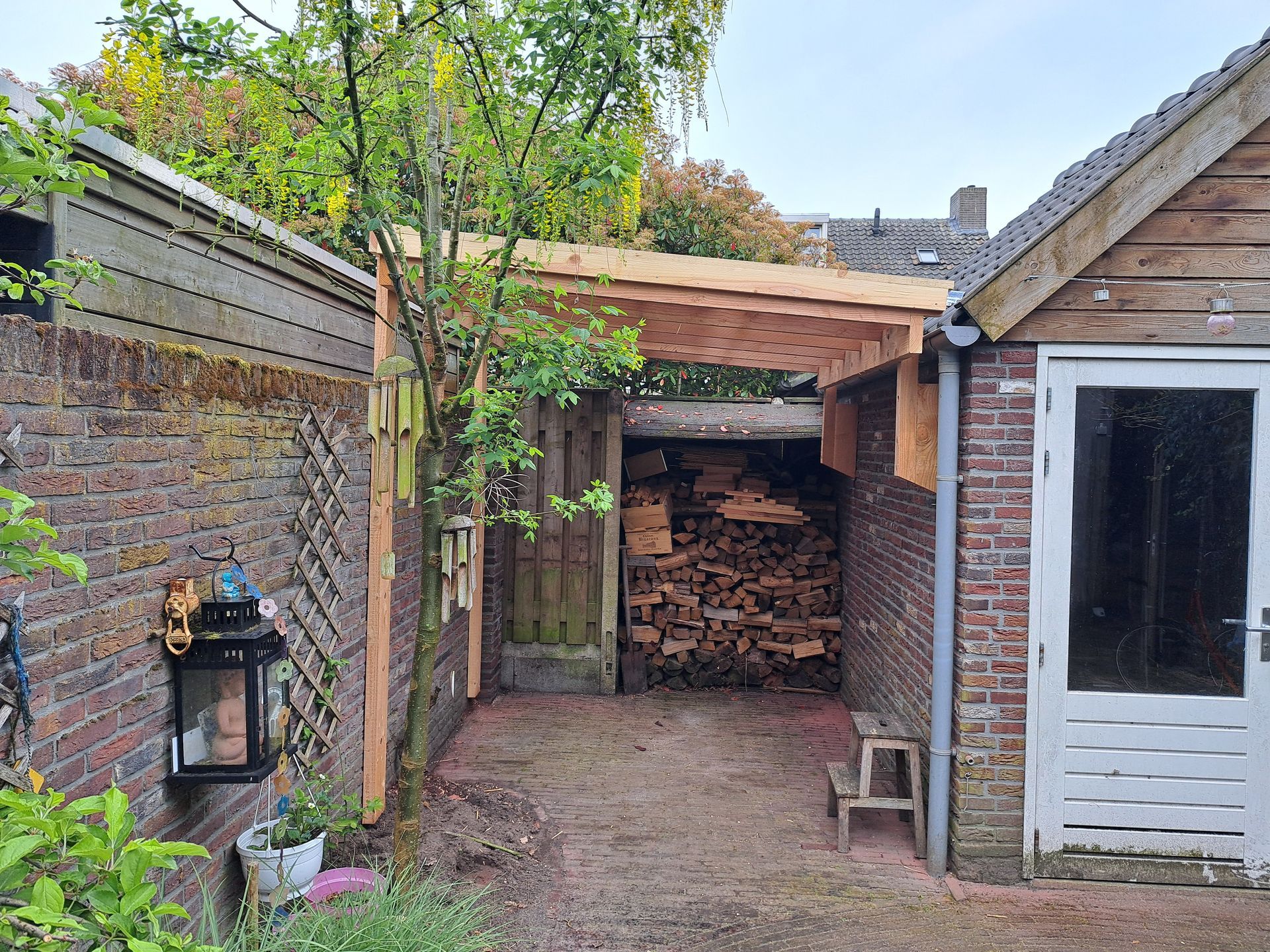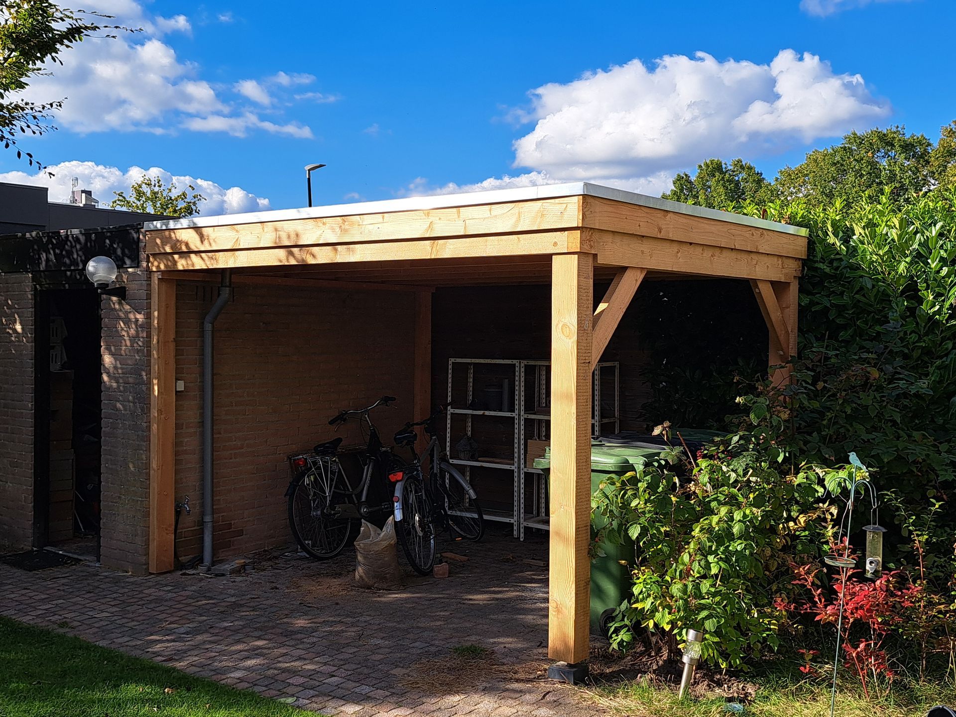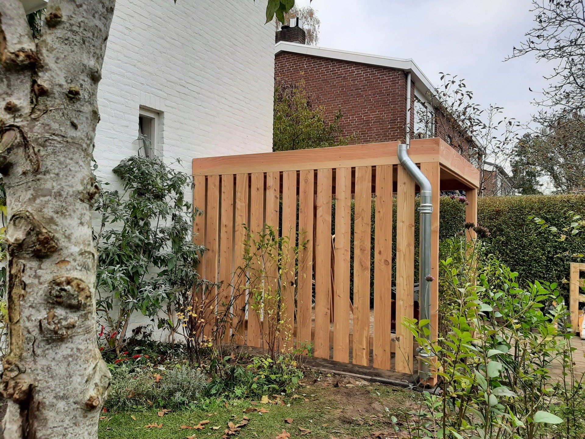 L-vormige overkapping om fietsen en hout droog te houden