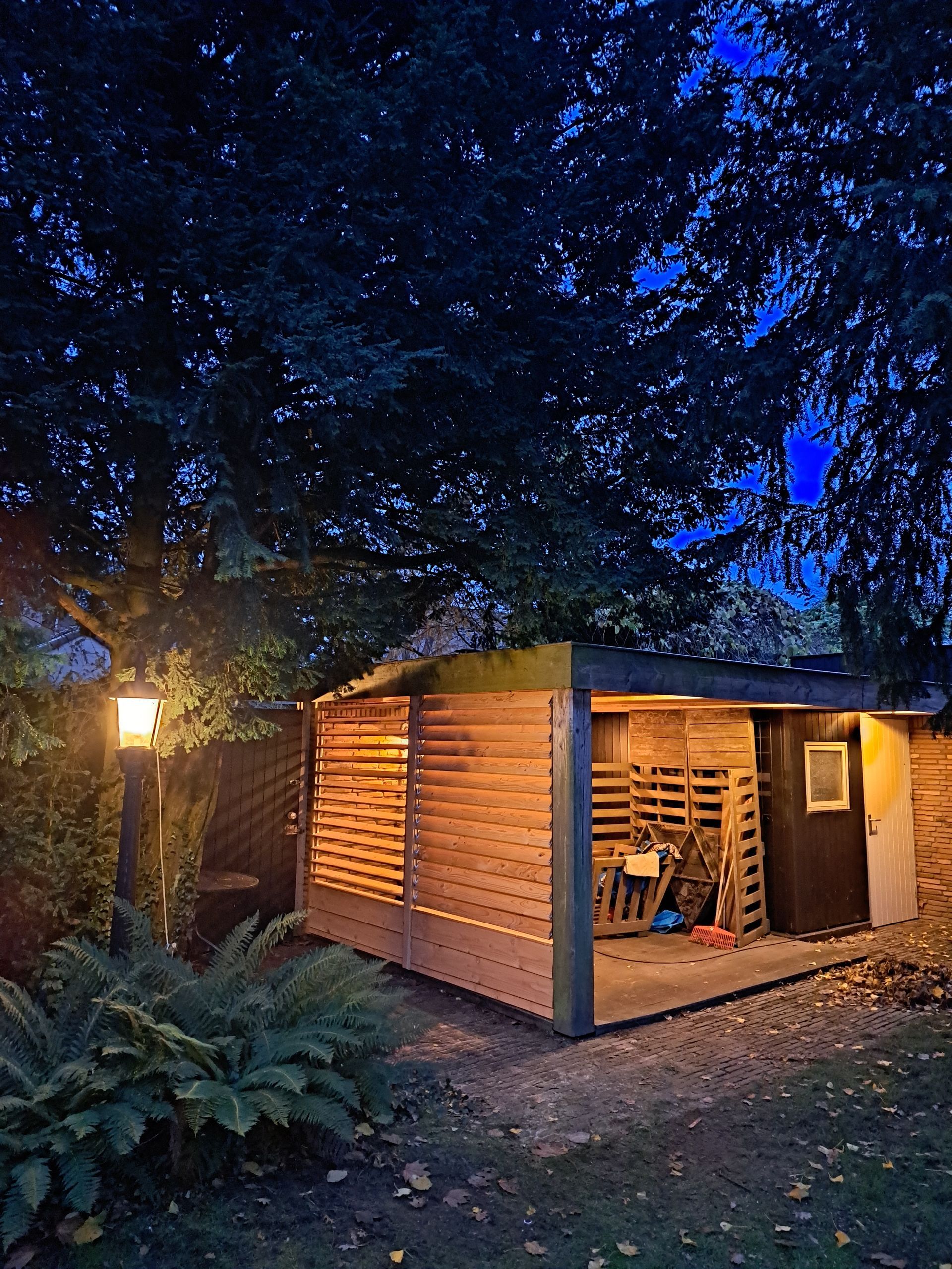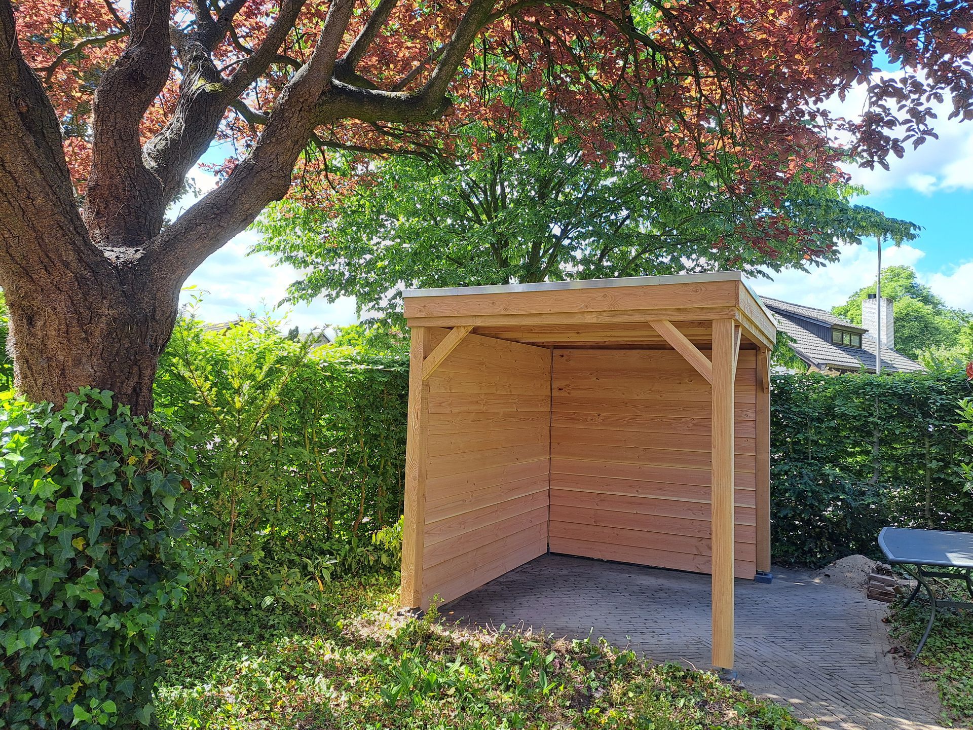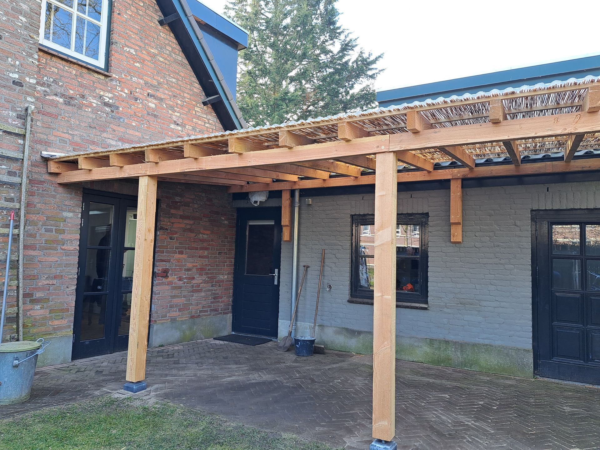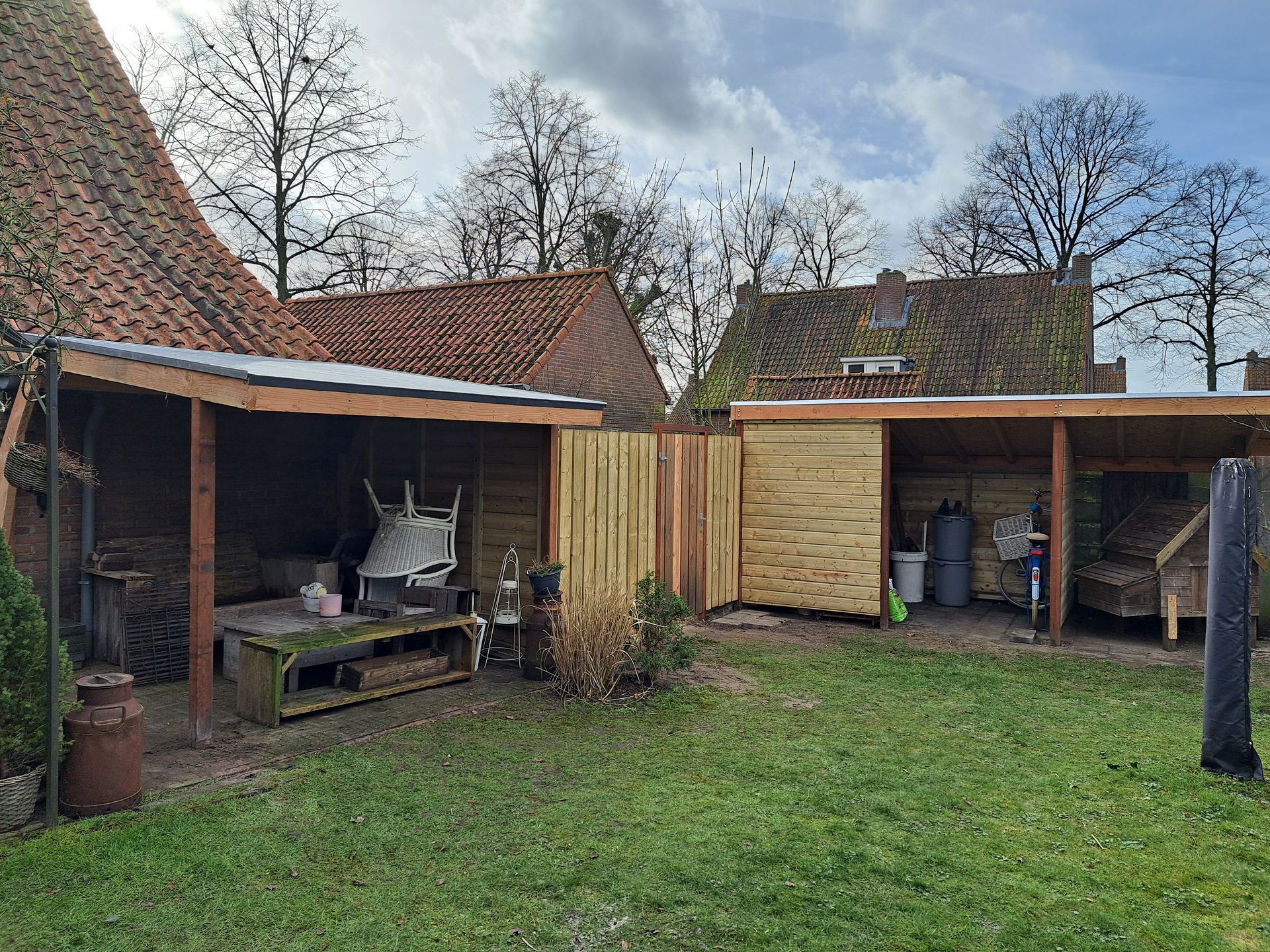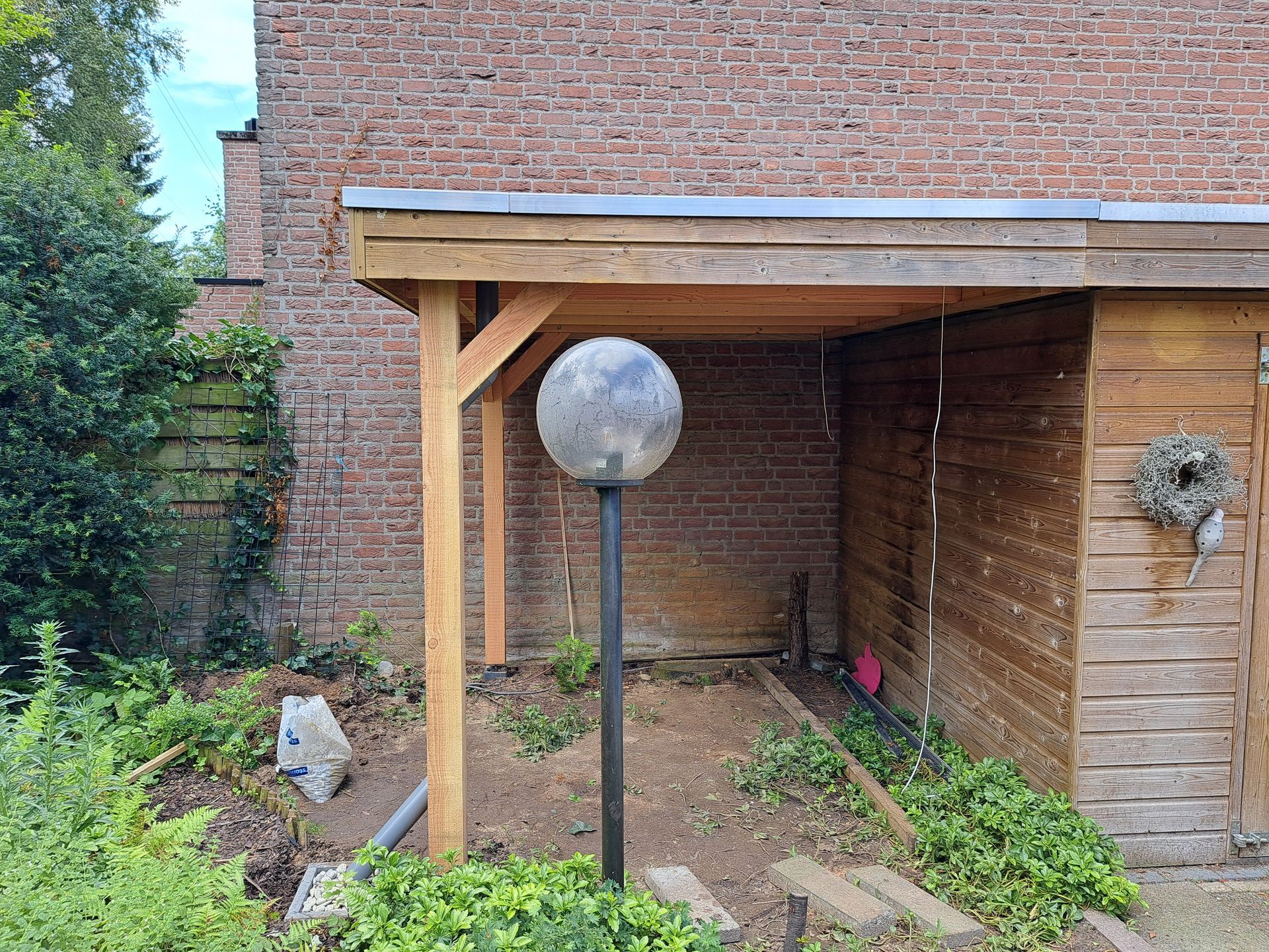 L-vormige overkapping om fietsen en hout droog te houden