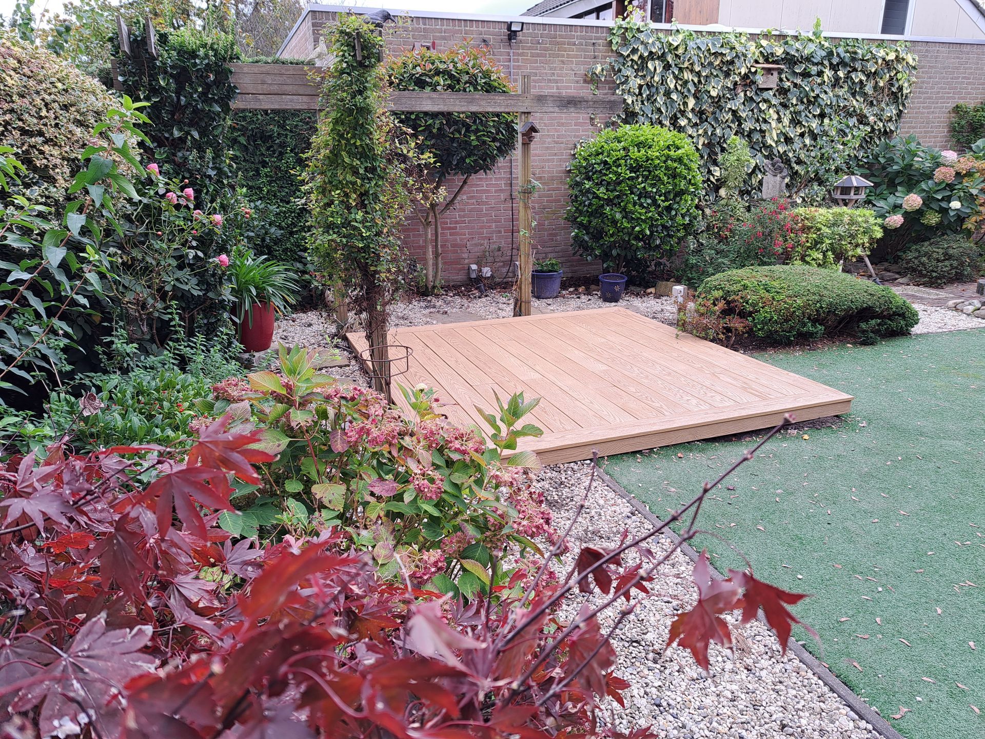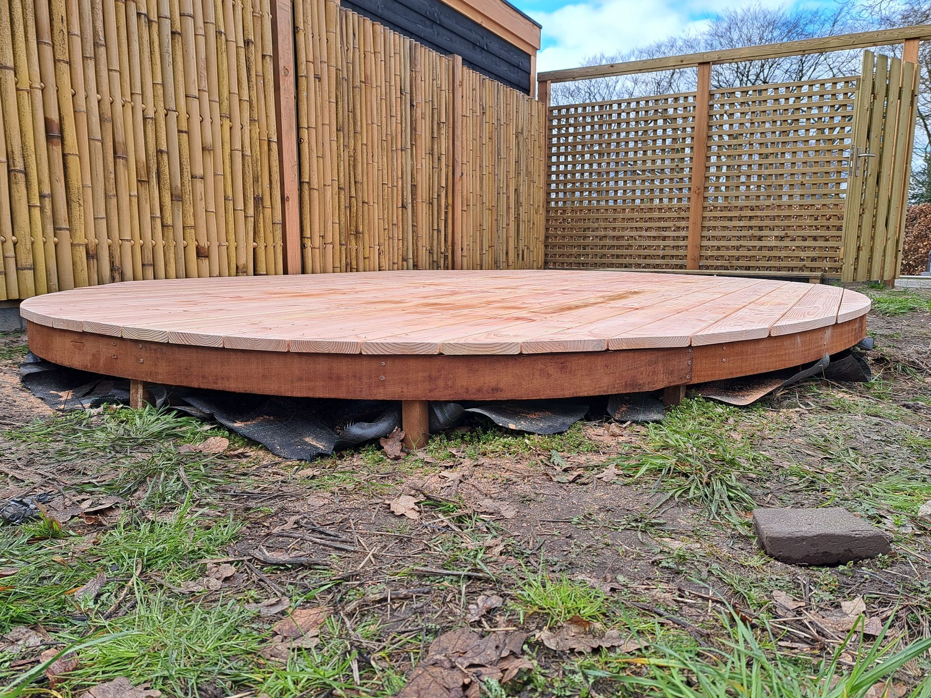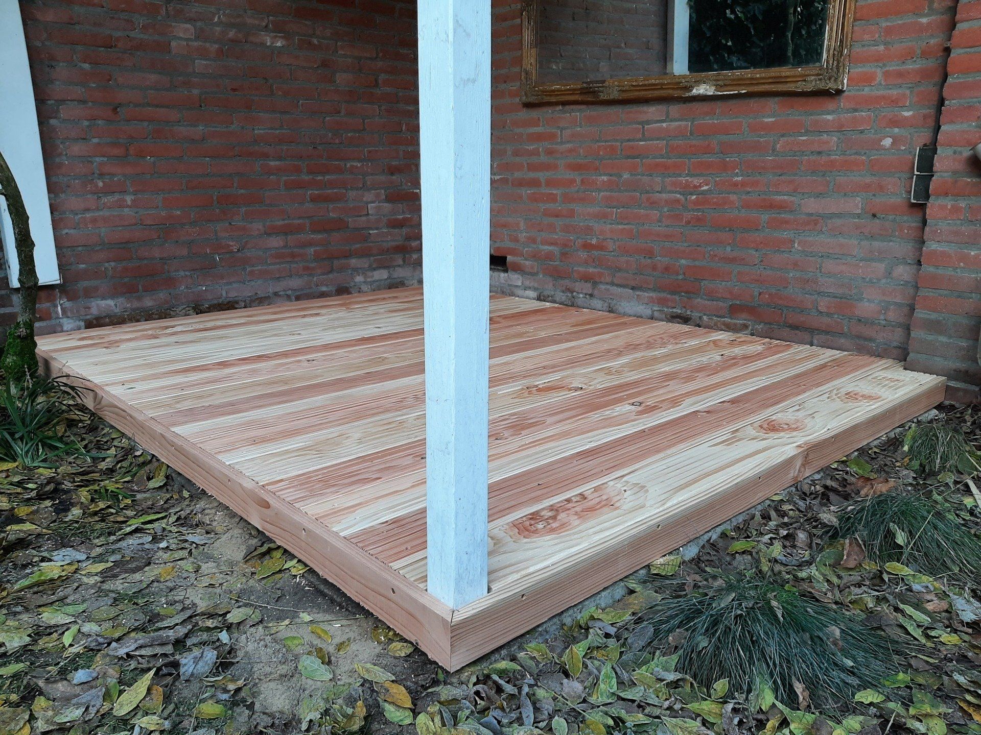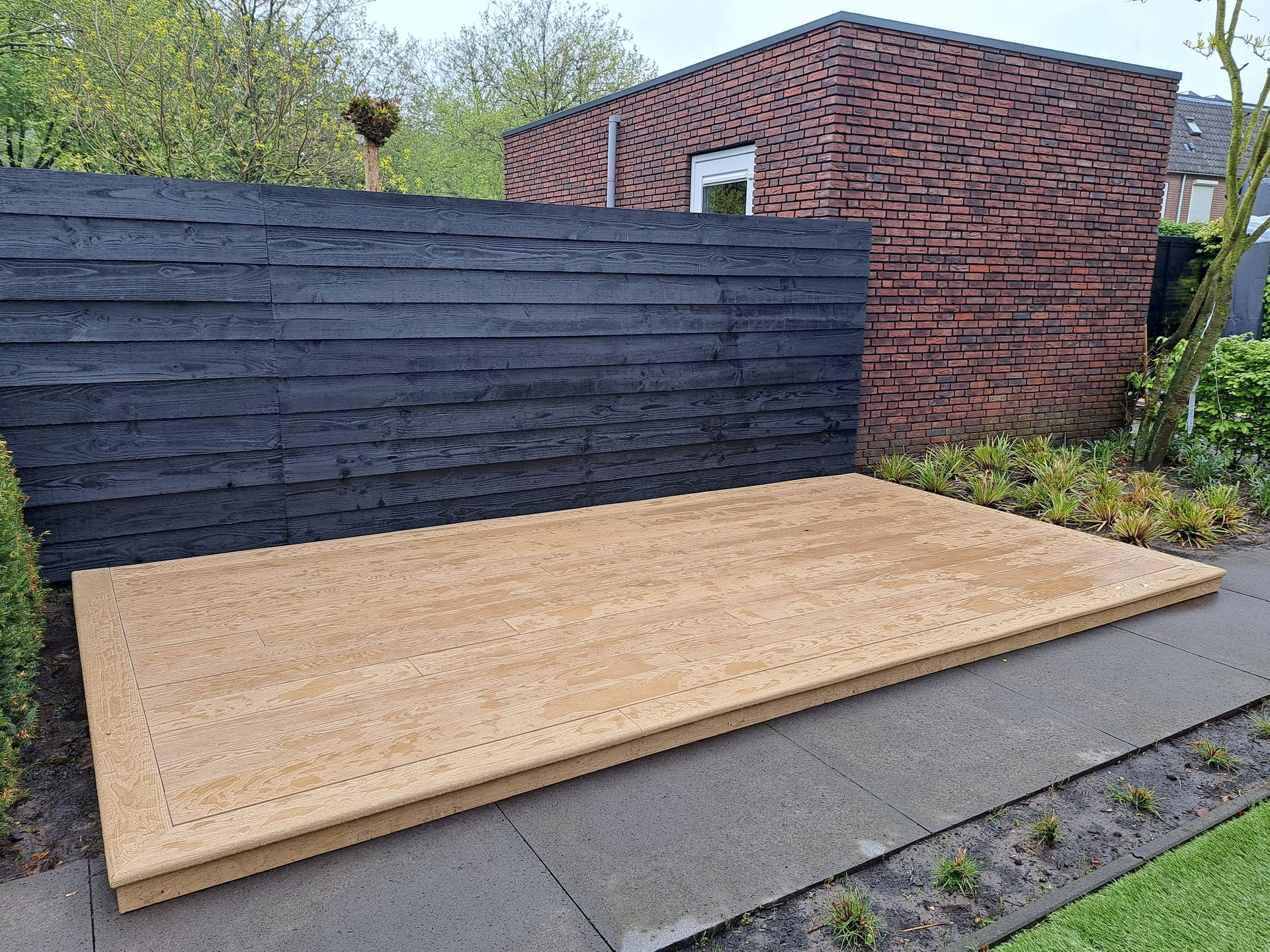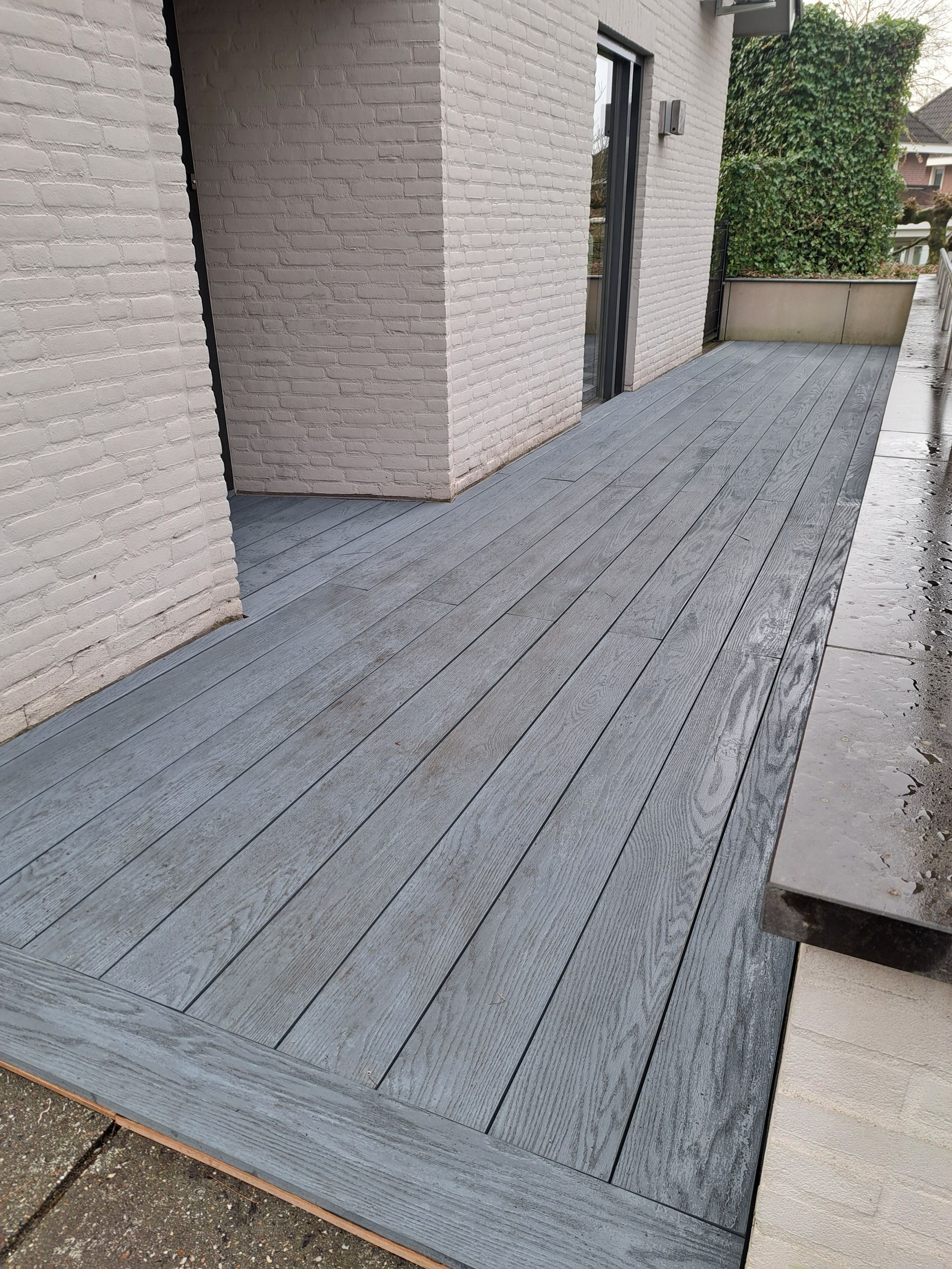 Composiet vlonder op houten regelwerk.
