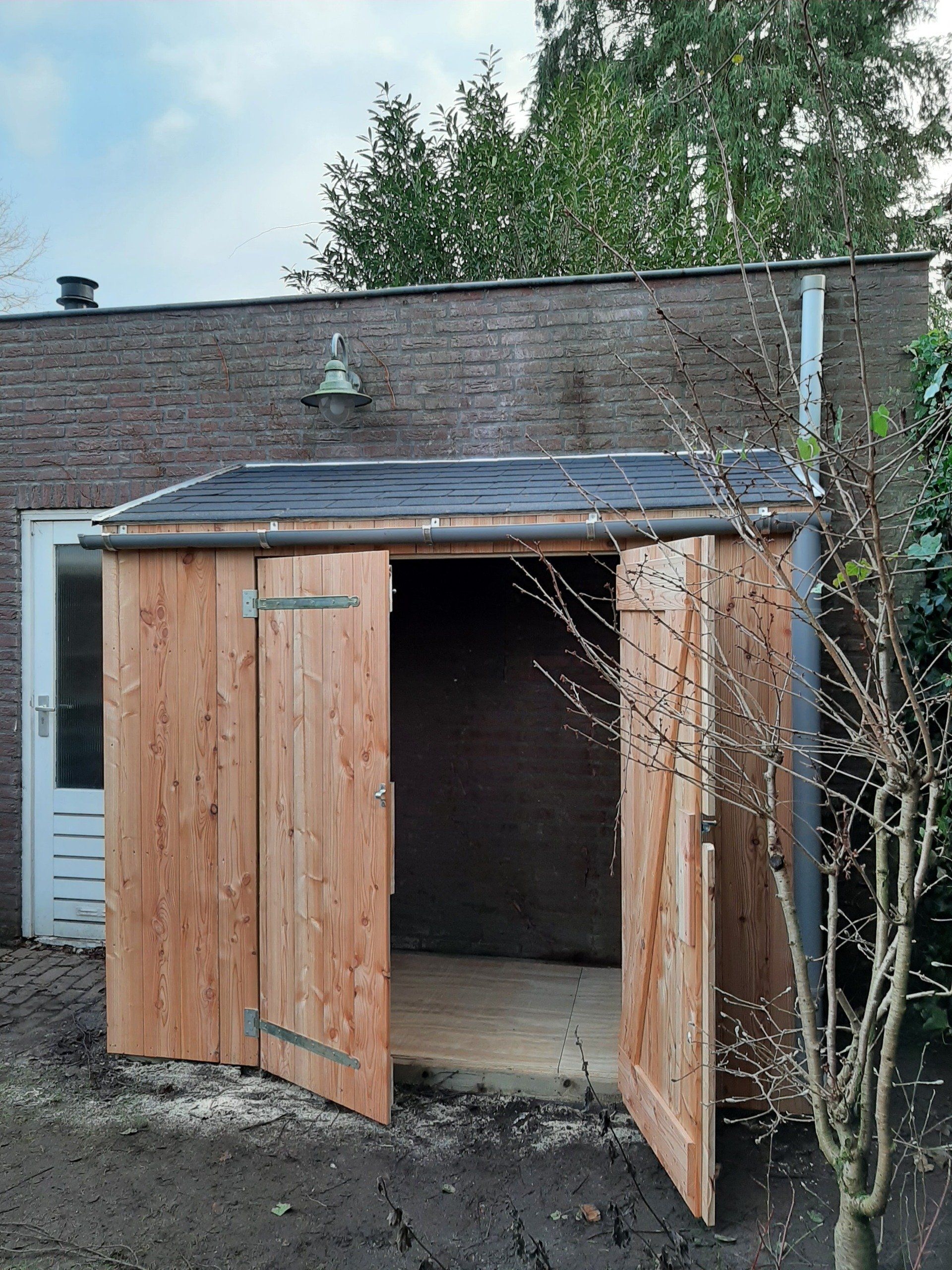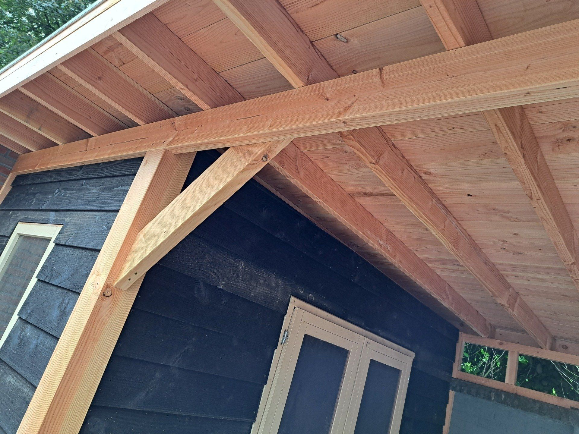 Douglas houten overkapping met inpandige schuur en hergebruikt raam en dubbele deur.