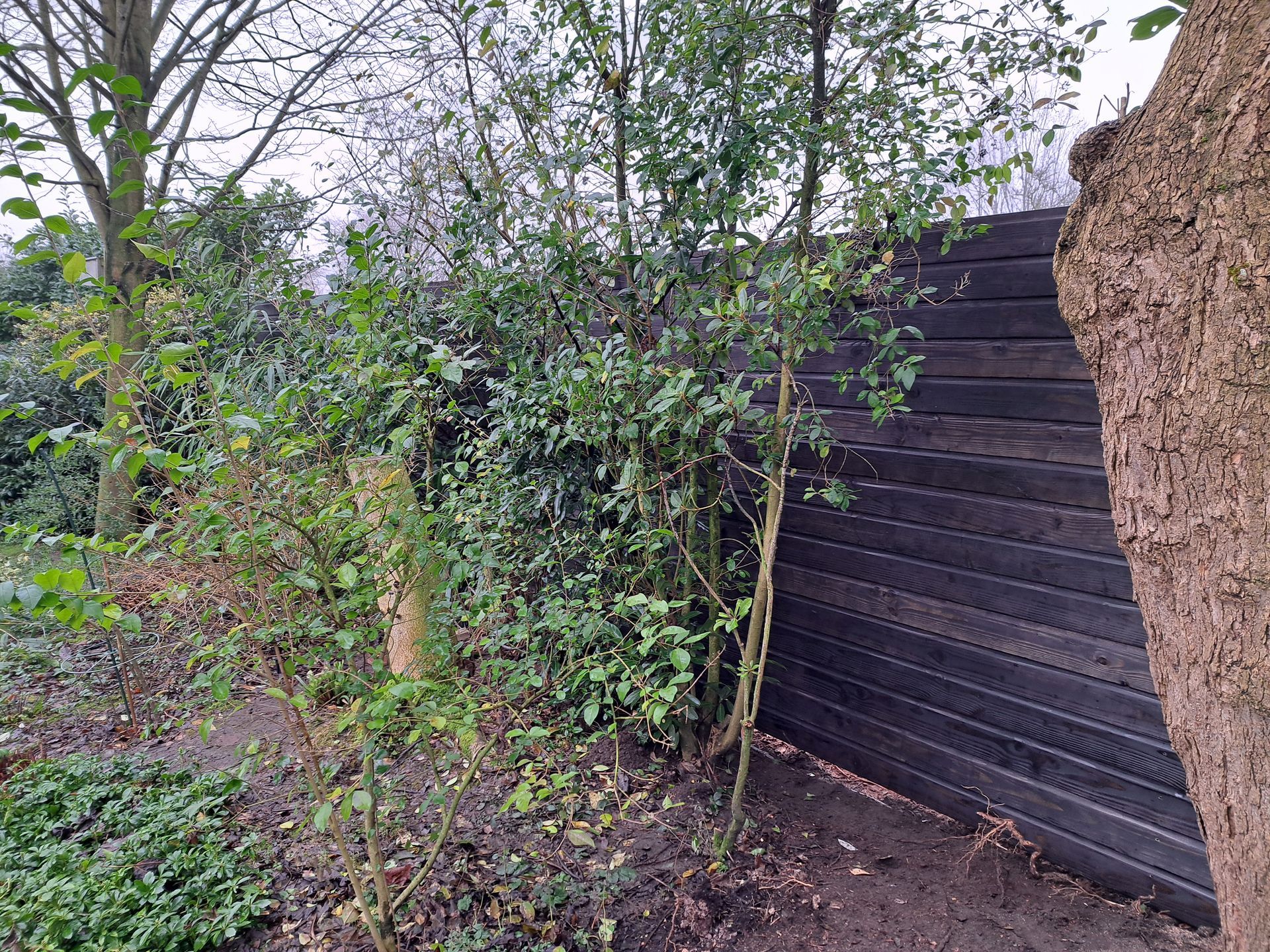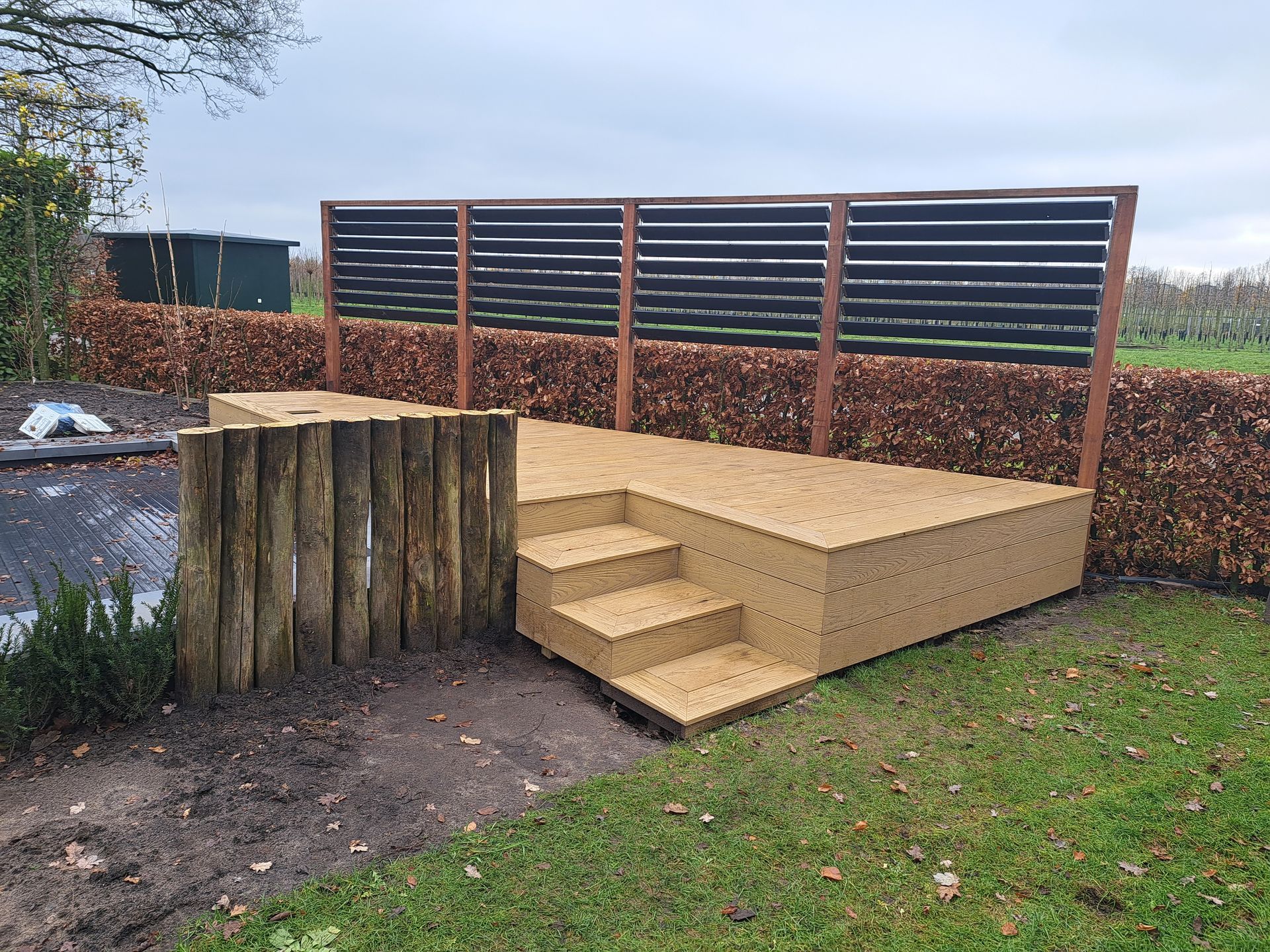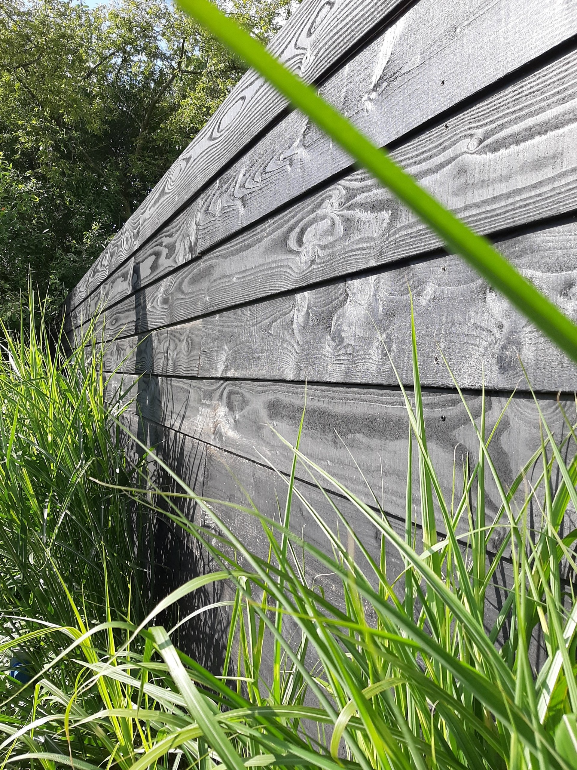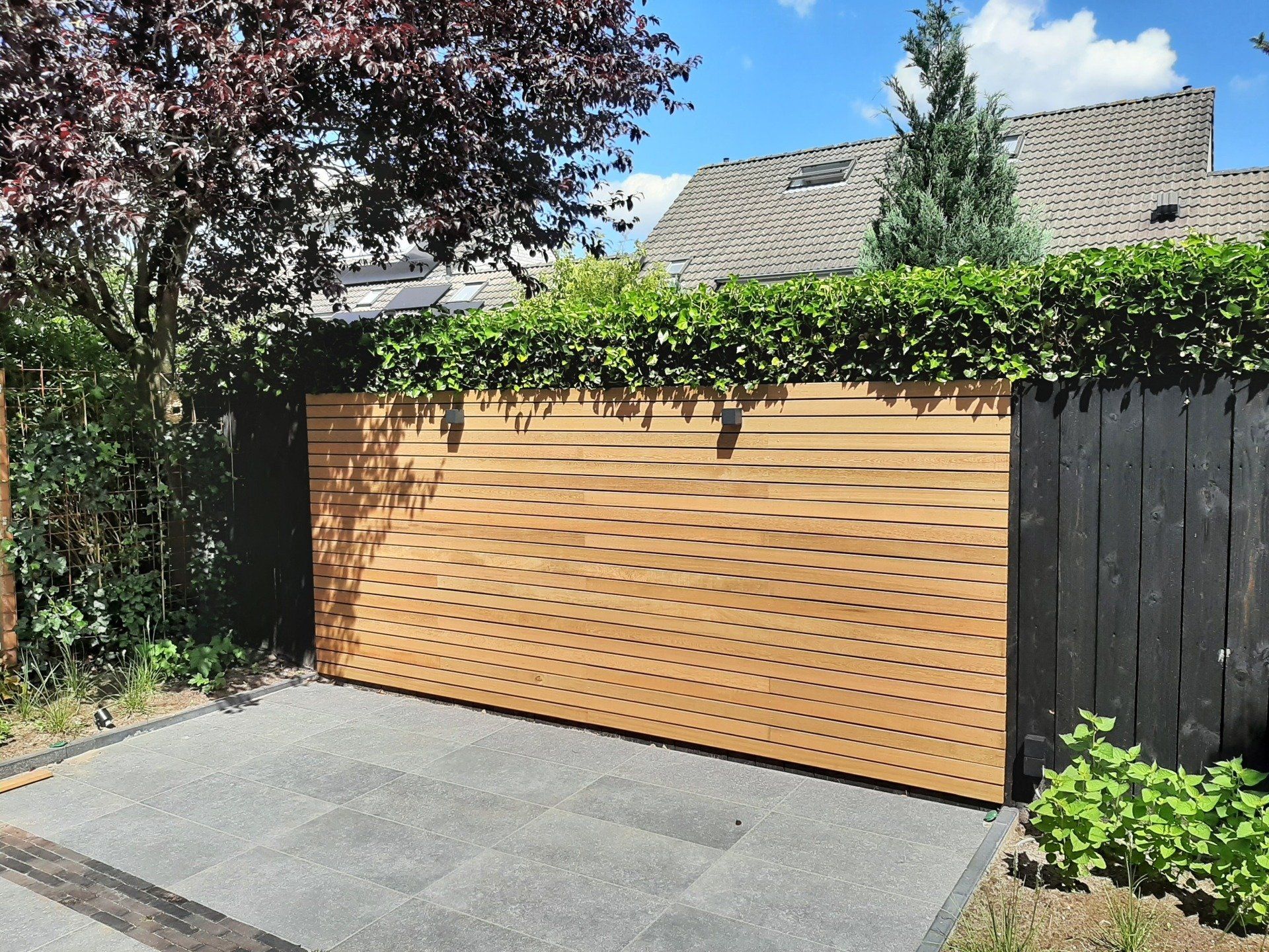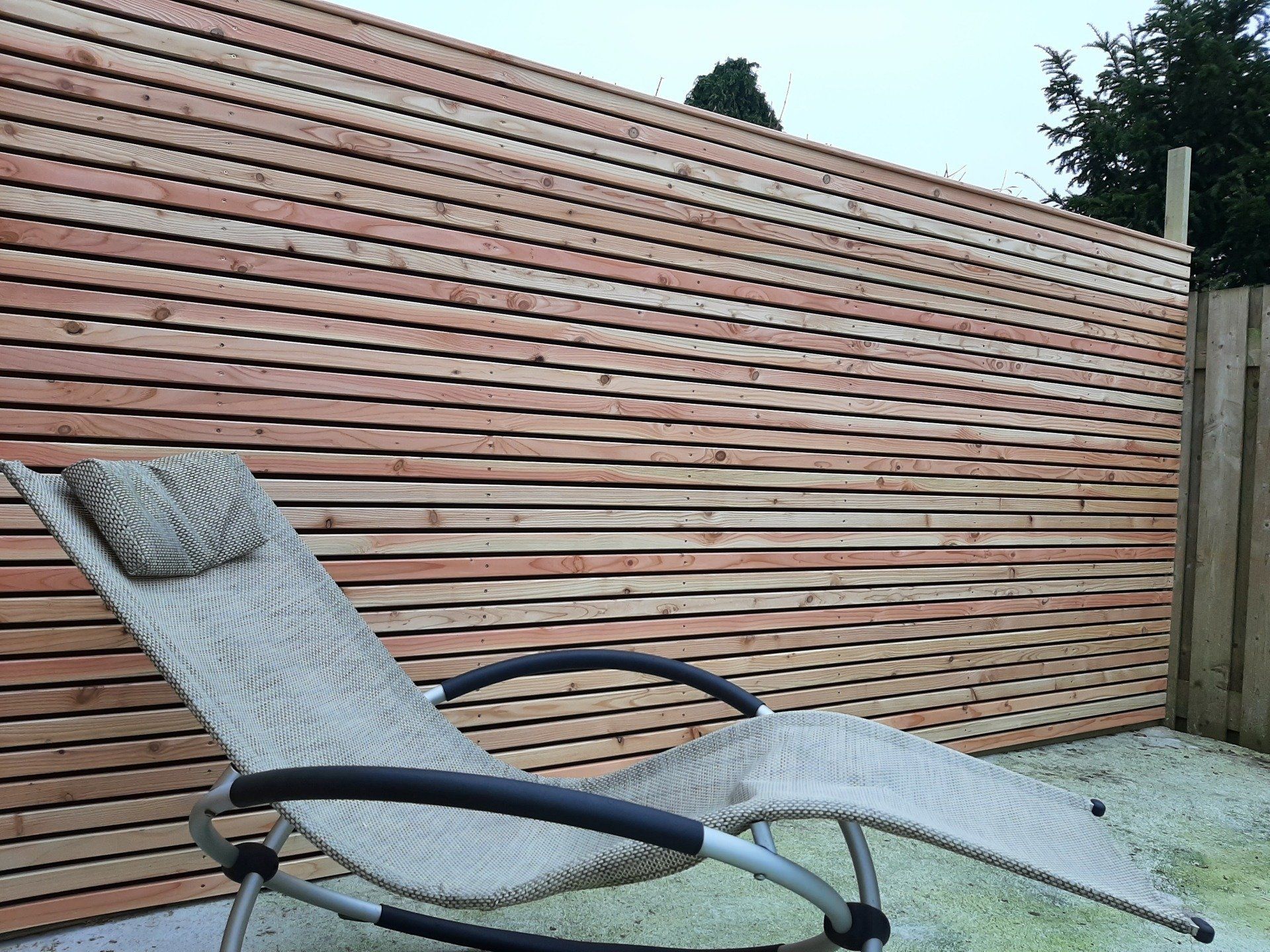 Smalle latten van Douglas met zwart doek achter de latten voor maximale privacy.