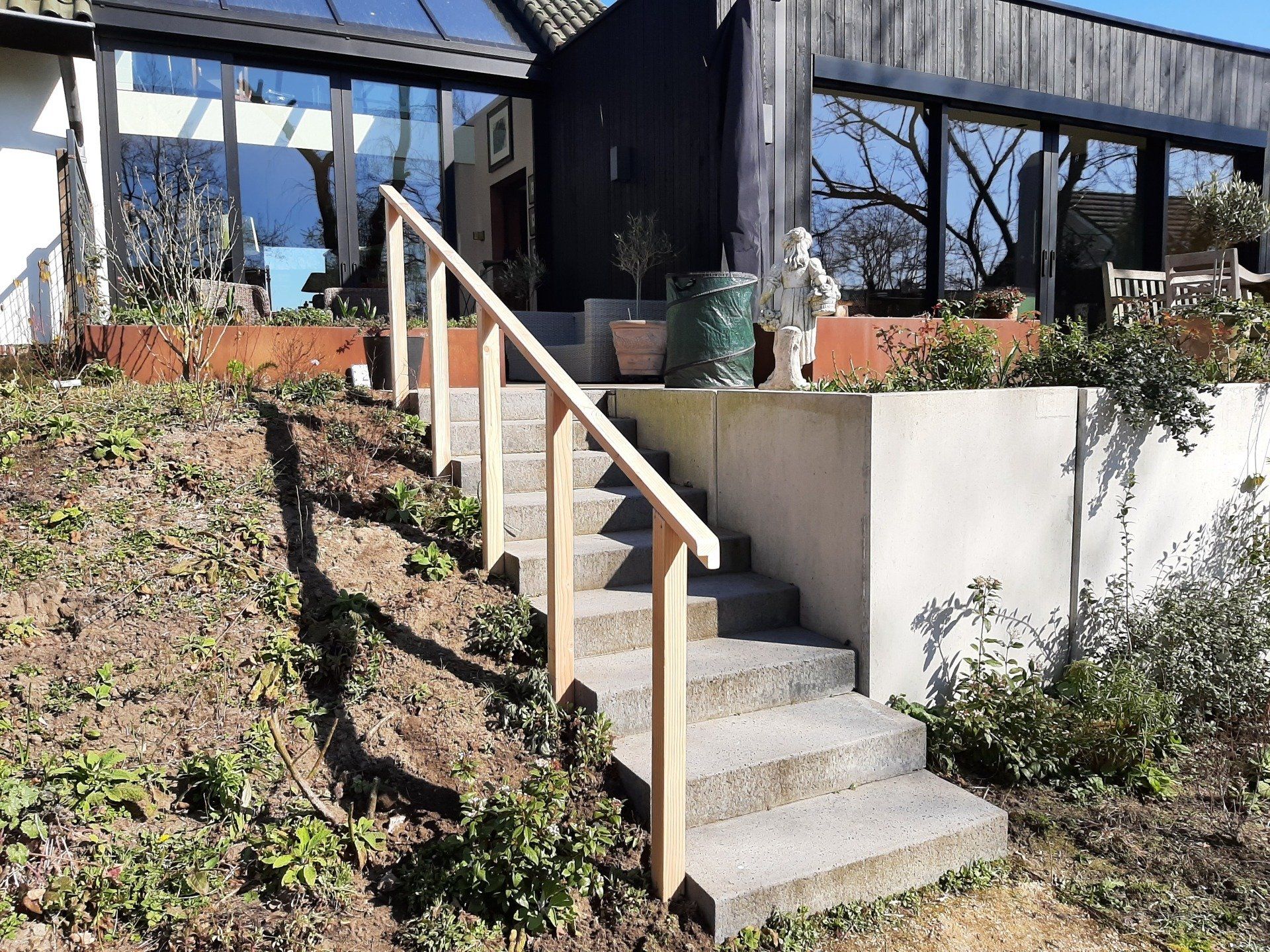 Trapleuning aan betonnen tuintrap voor meer veiligheid.