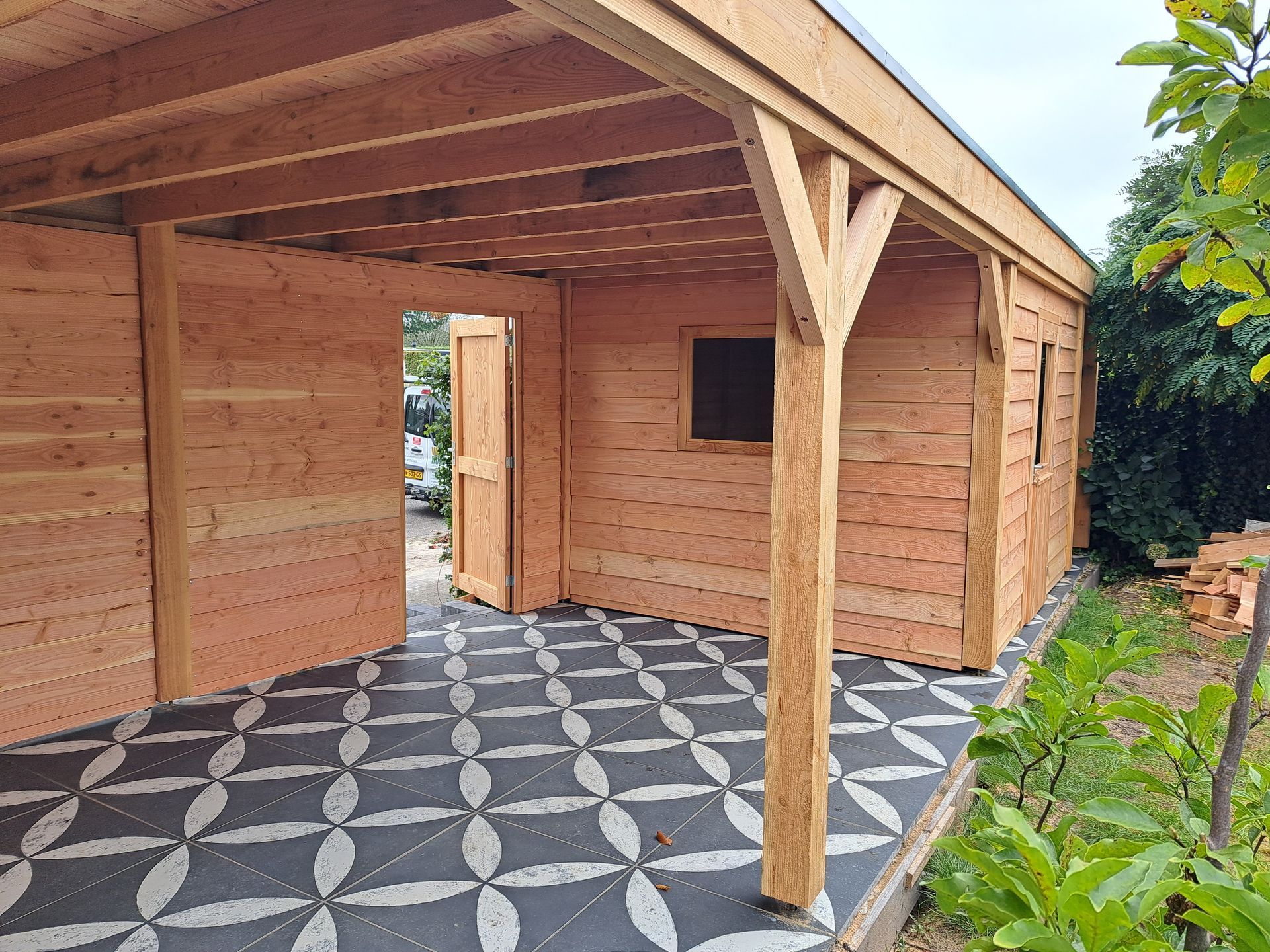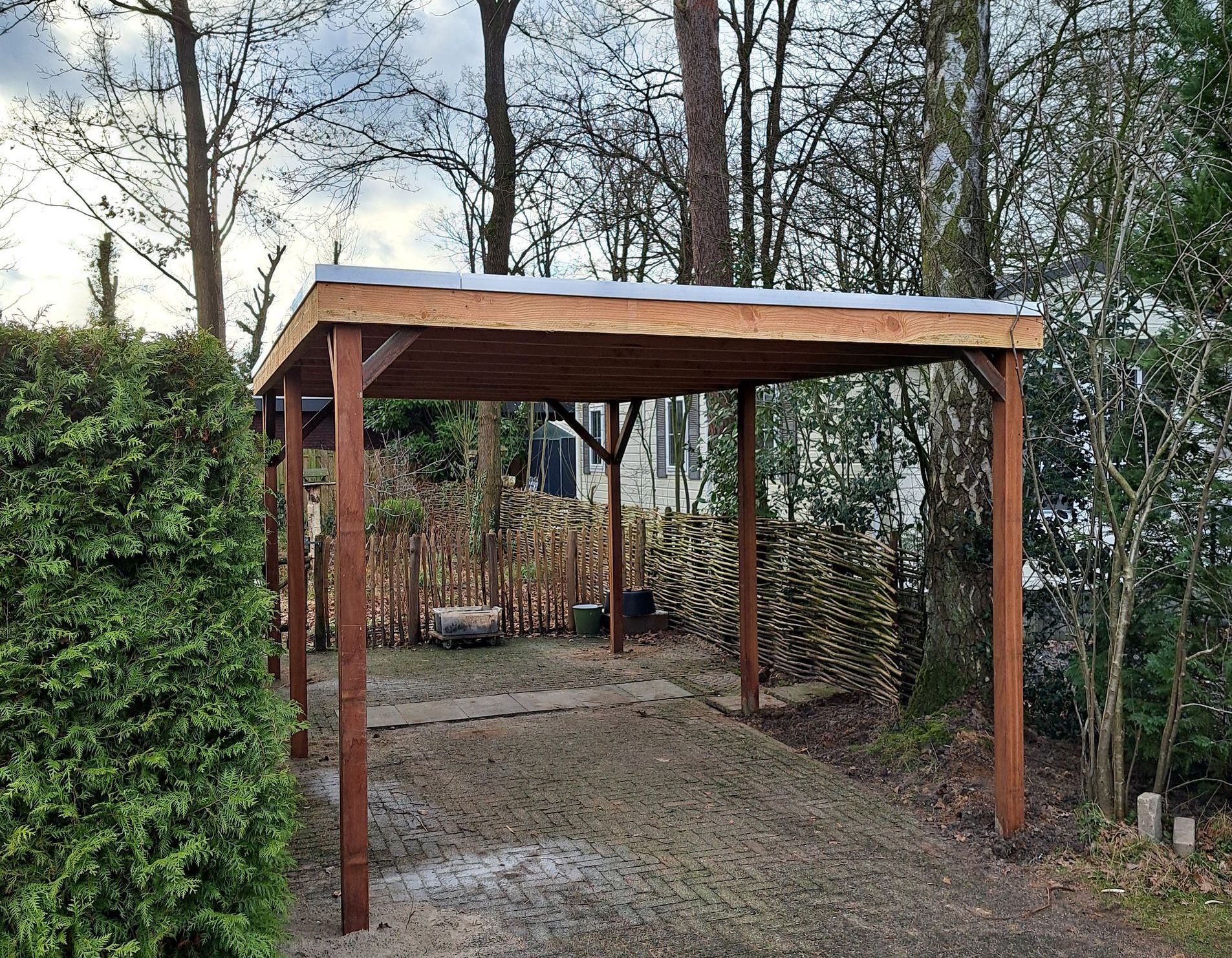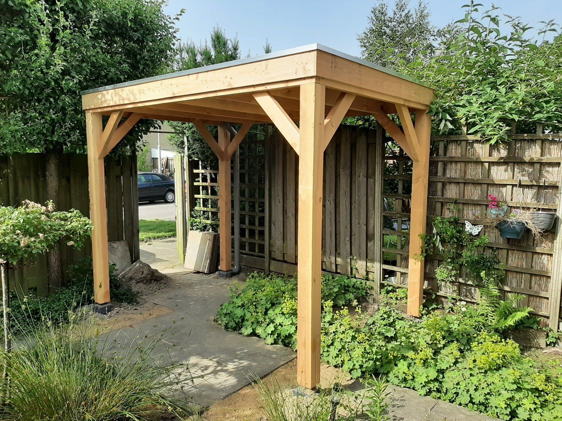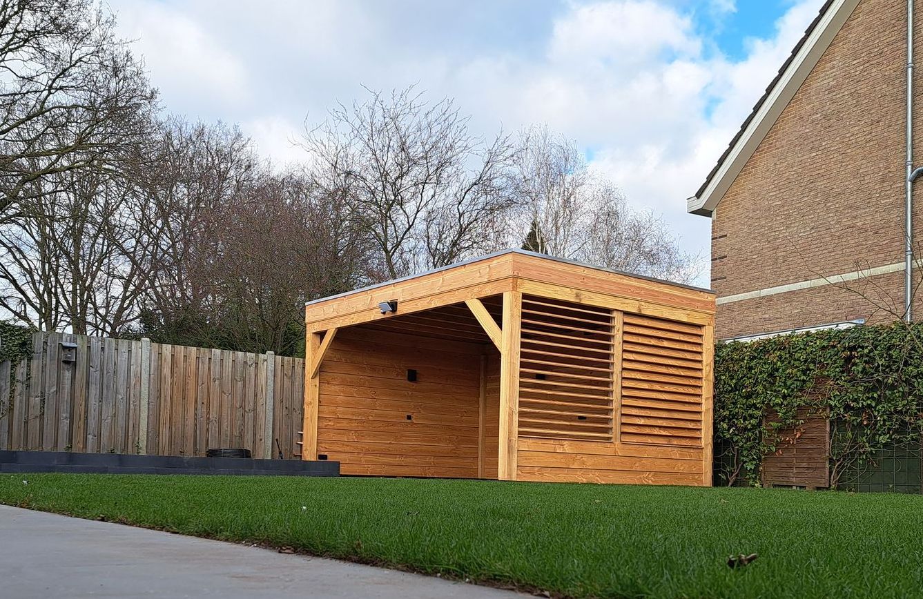 Douglas-houten overkapping met inpandige schuur.