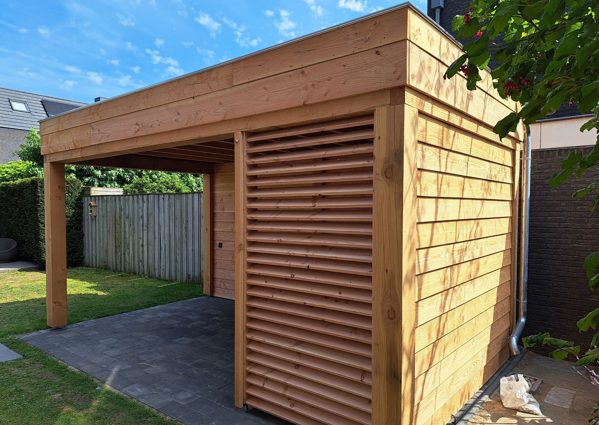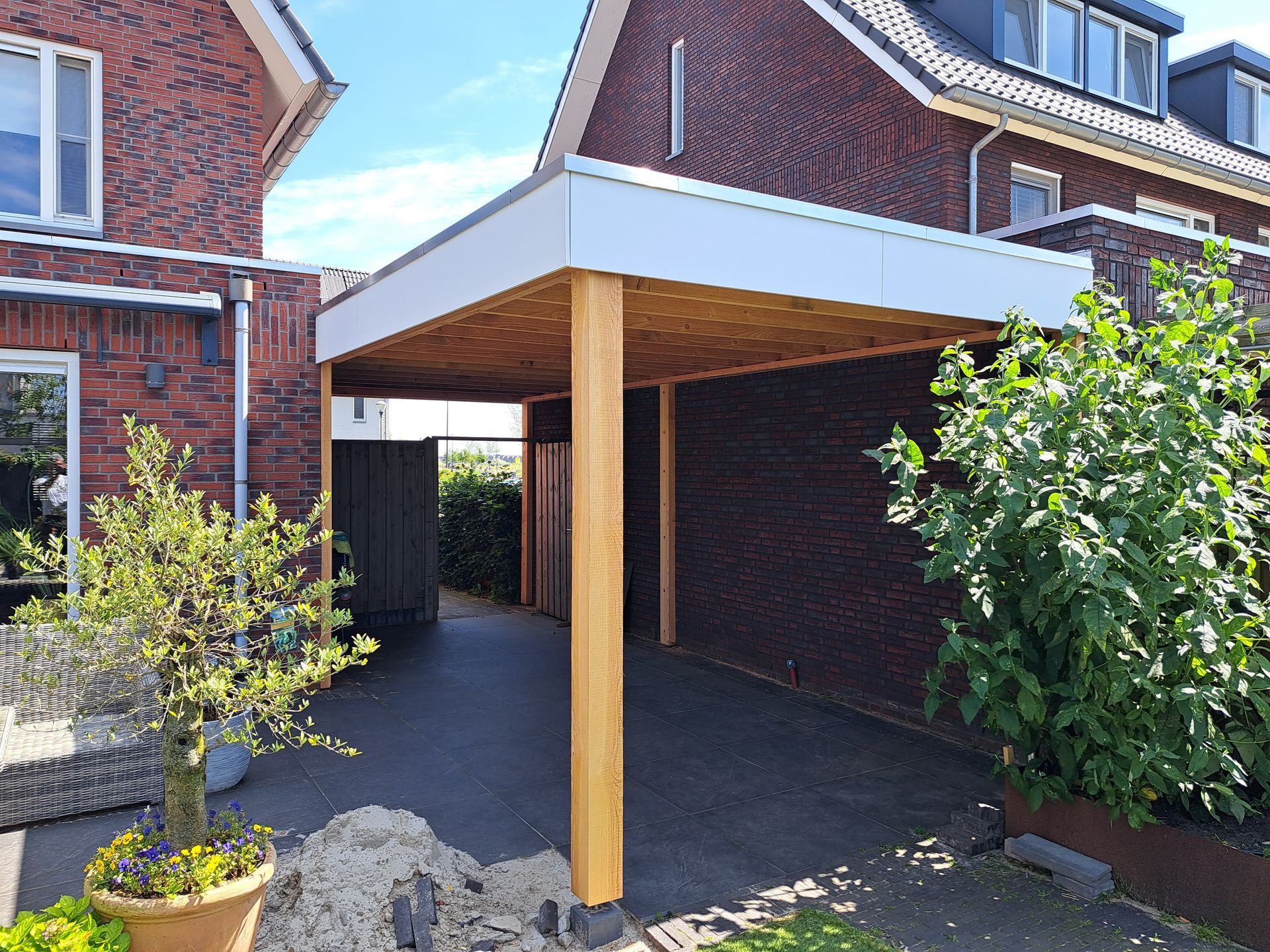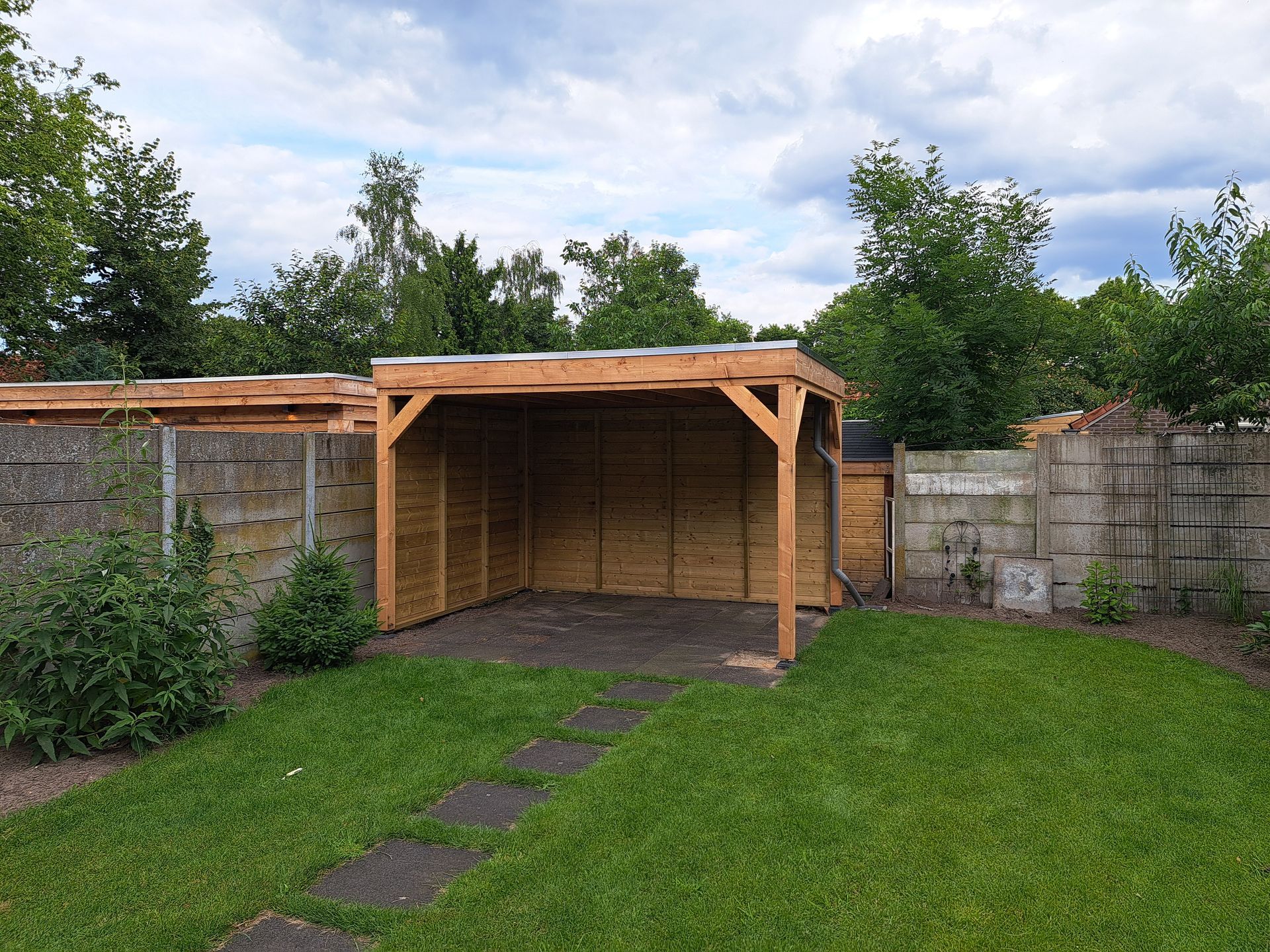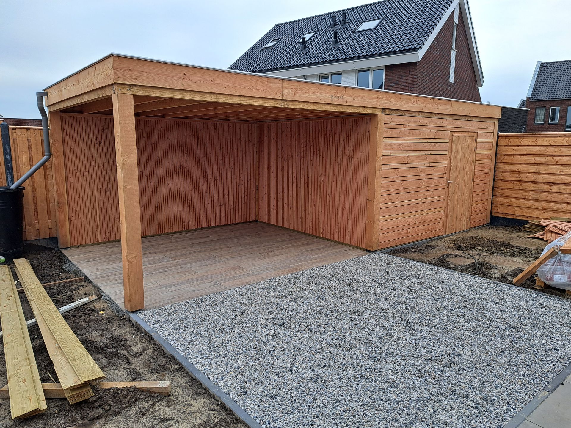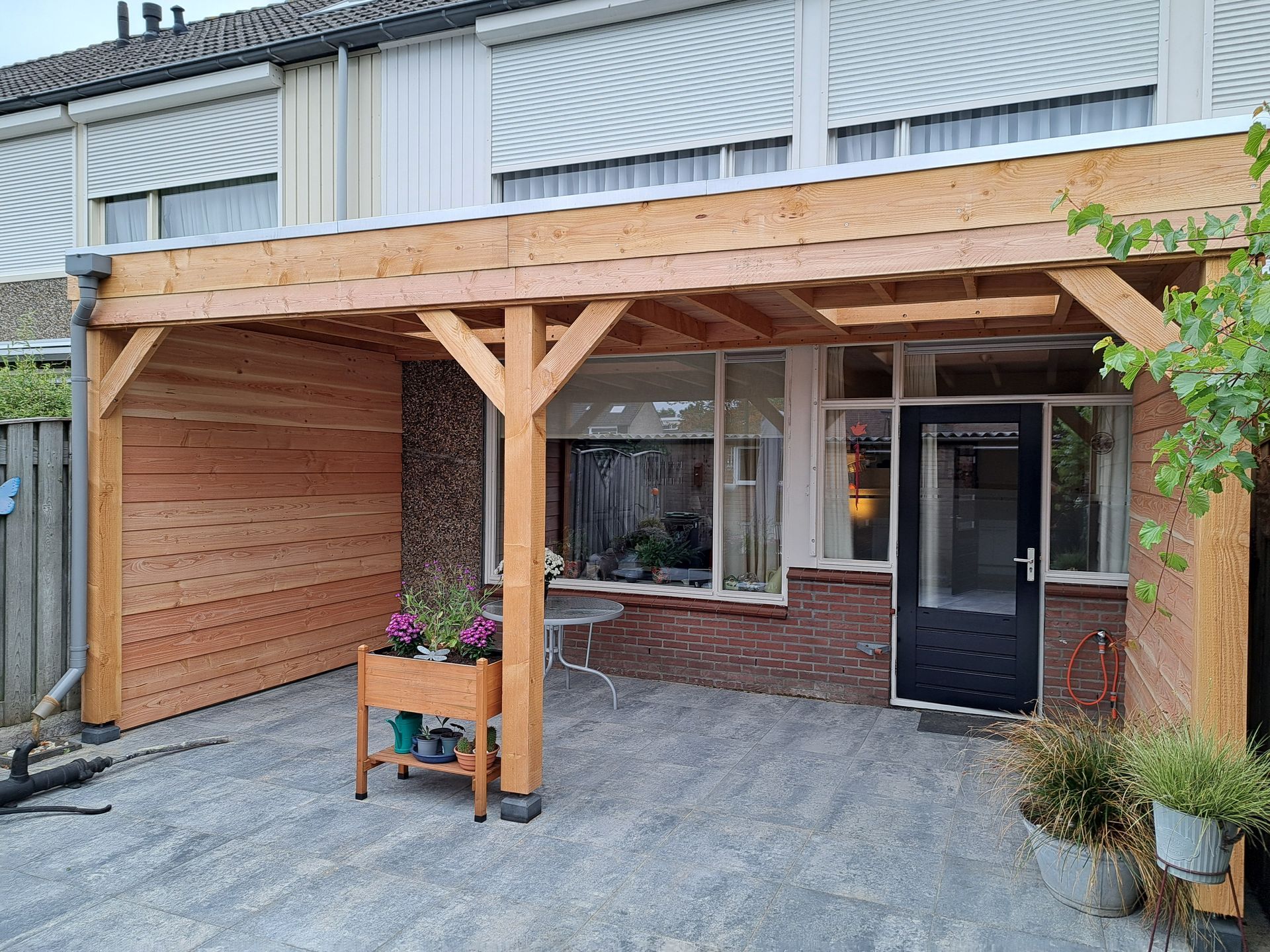 Douglas-houten overkapping met inpandige schuur.