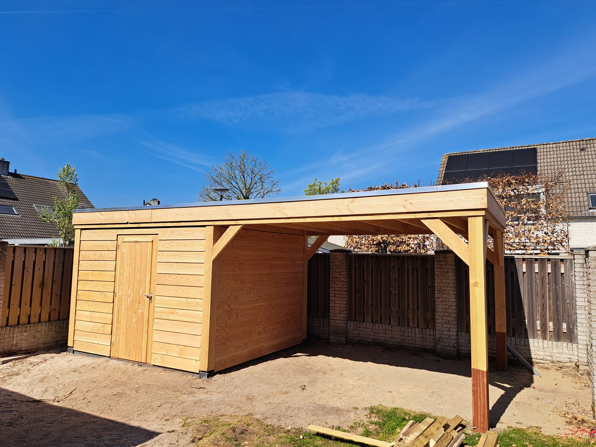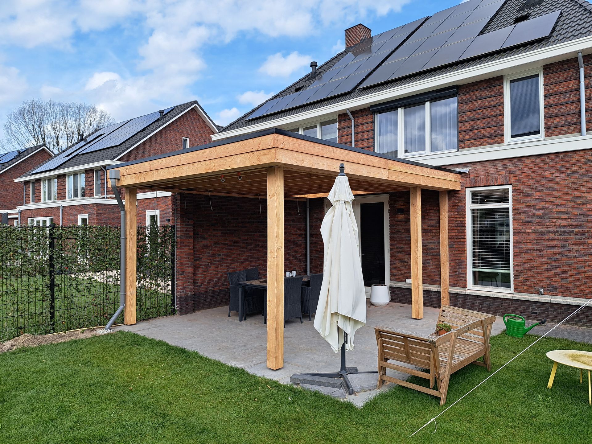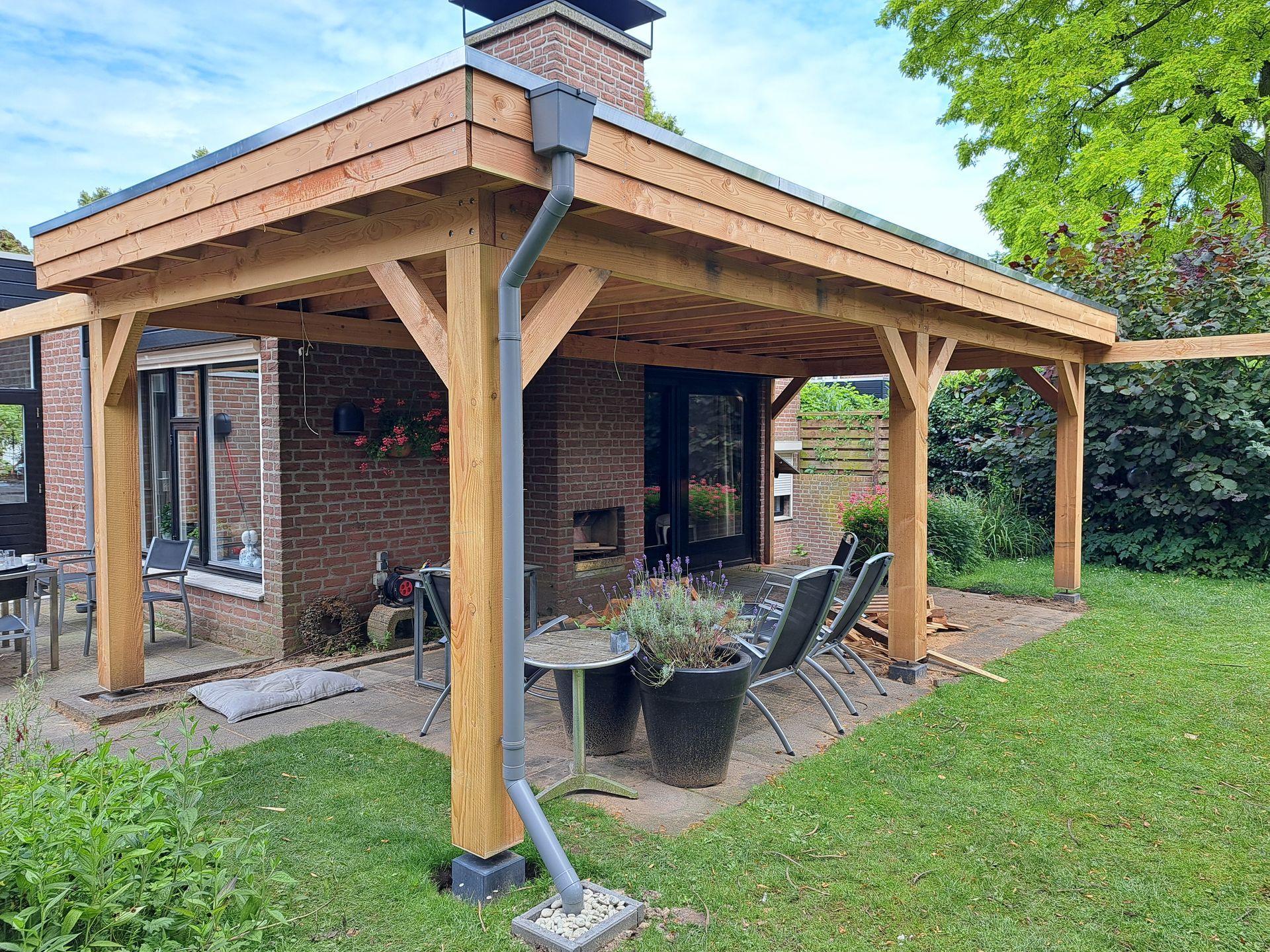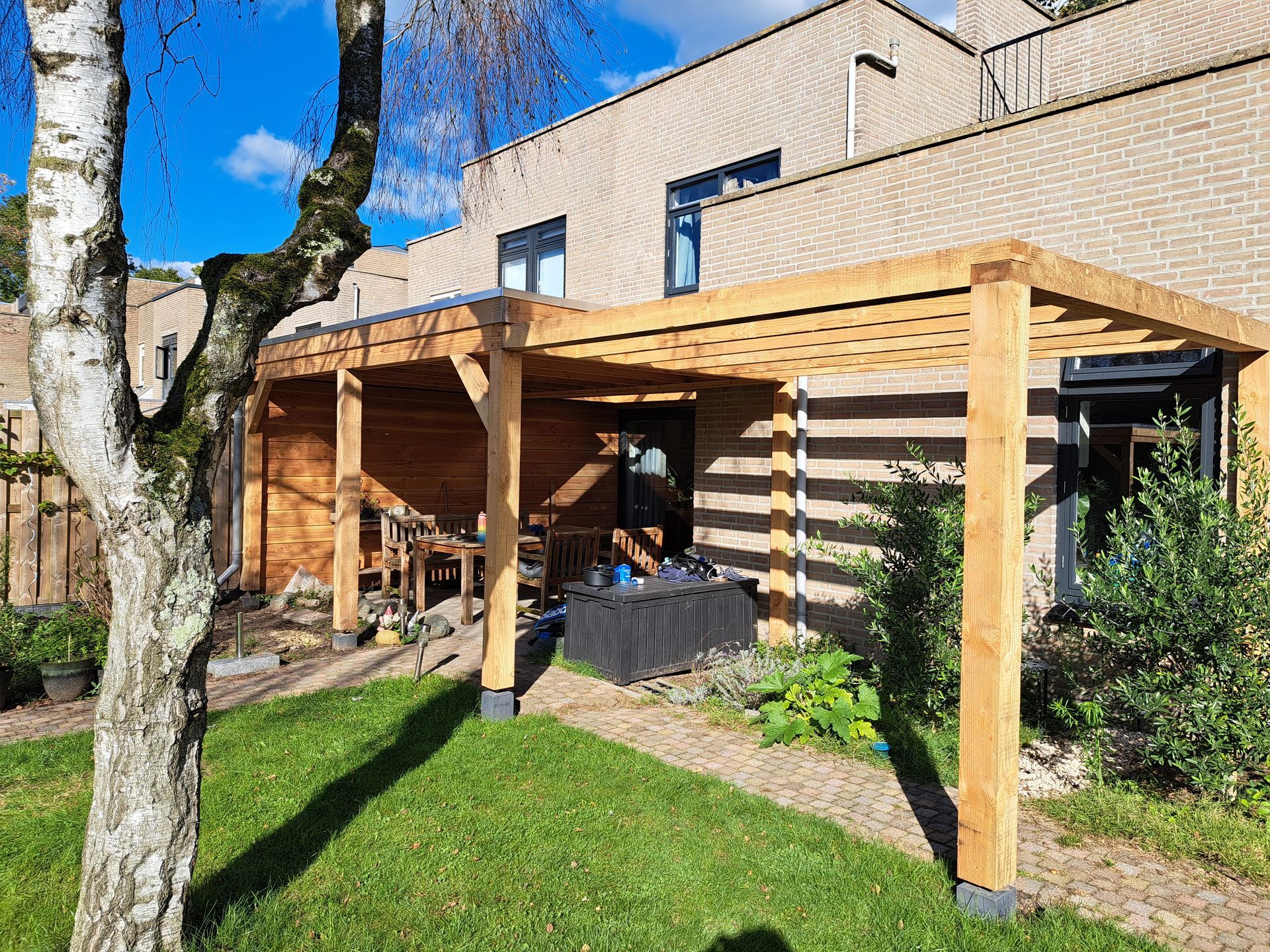 Douglas-houten overkapping met inpandige schuur.