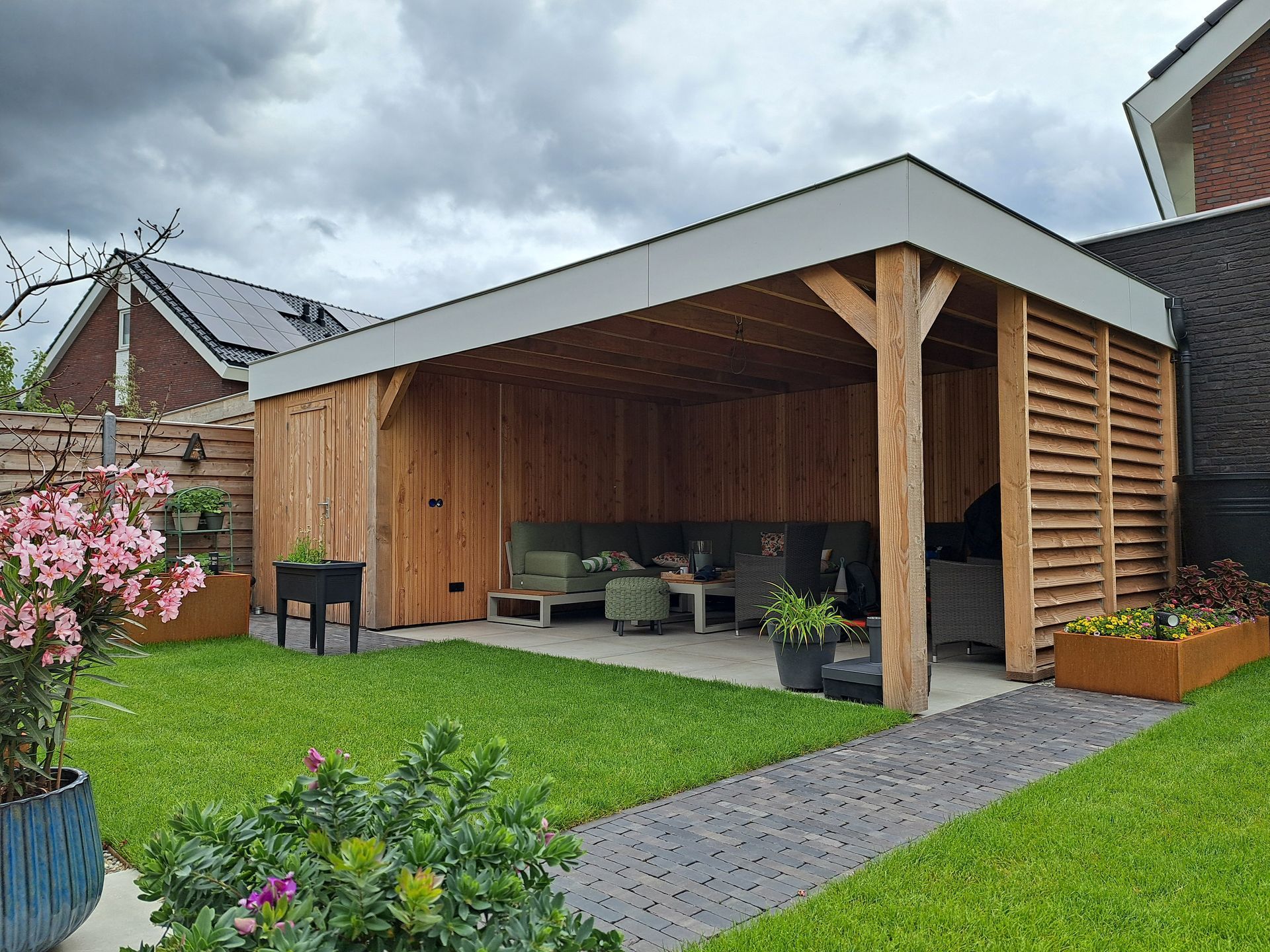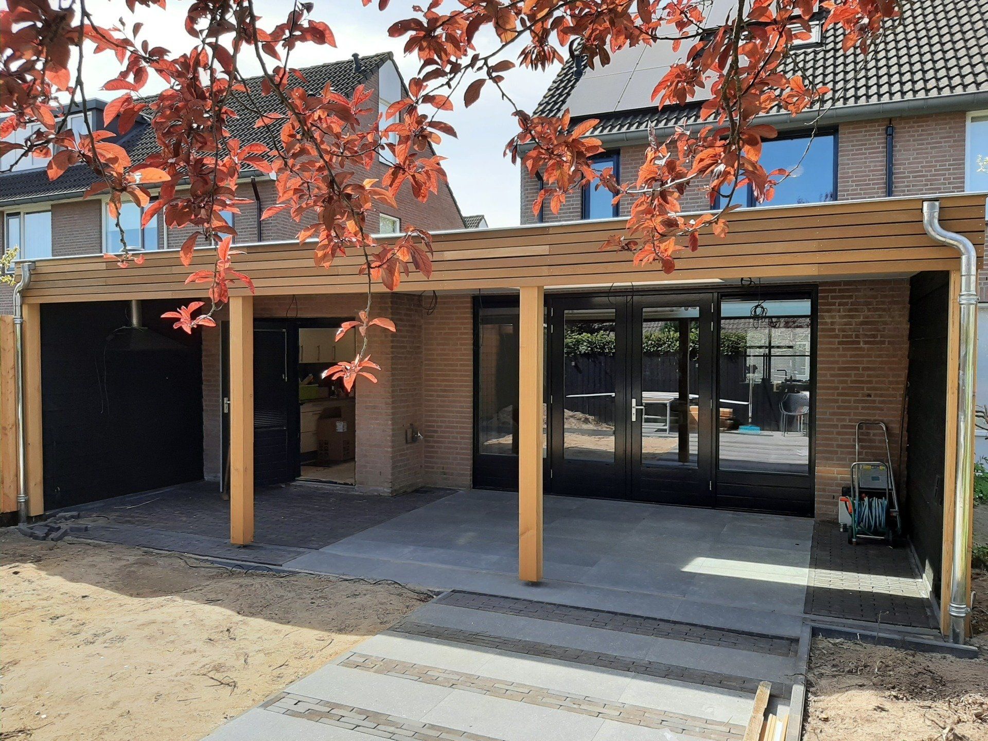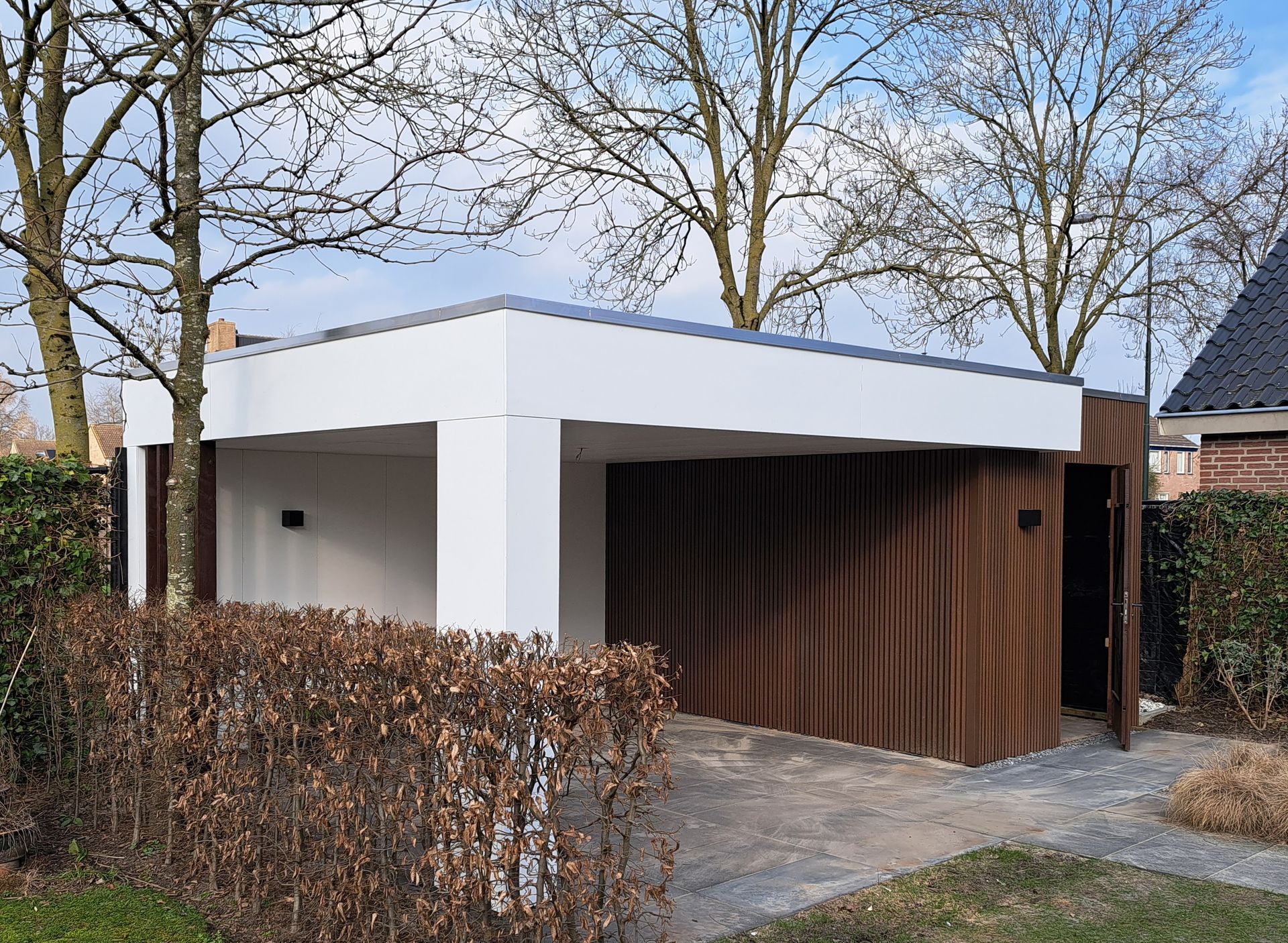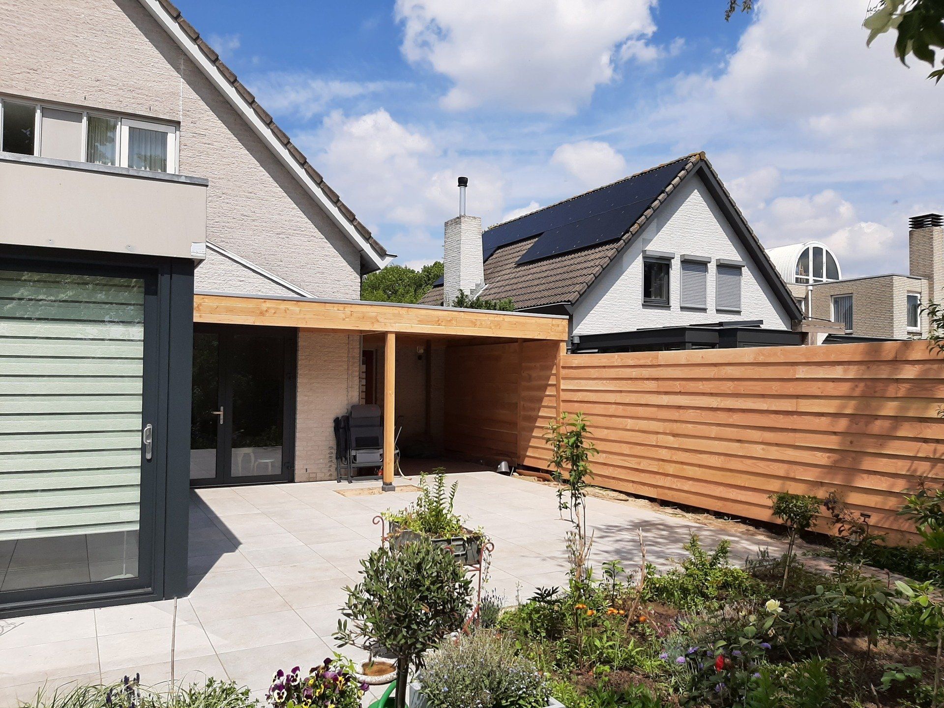Douglas-houten overkapping met inpandige schuur.