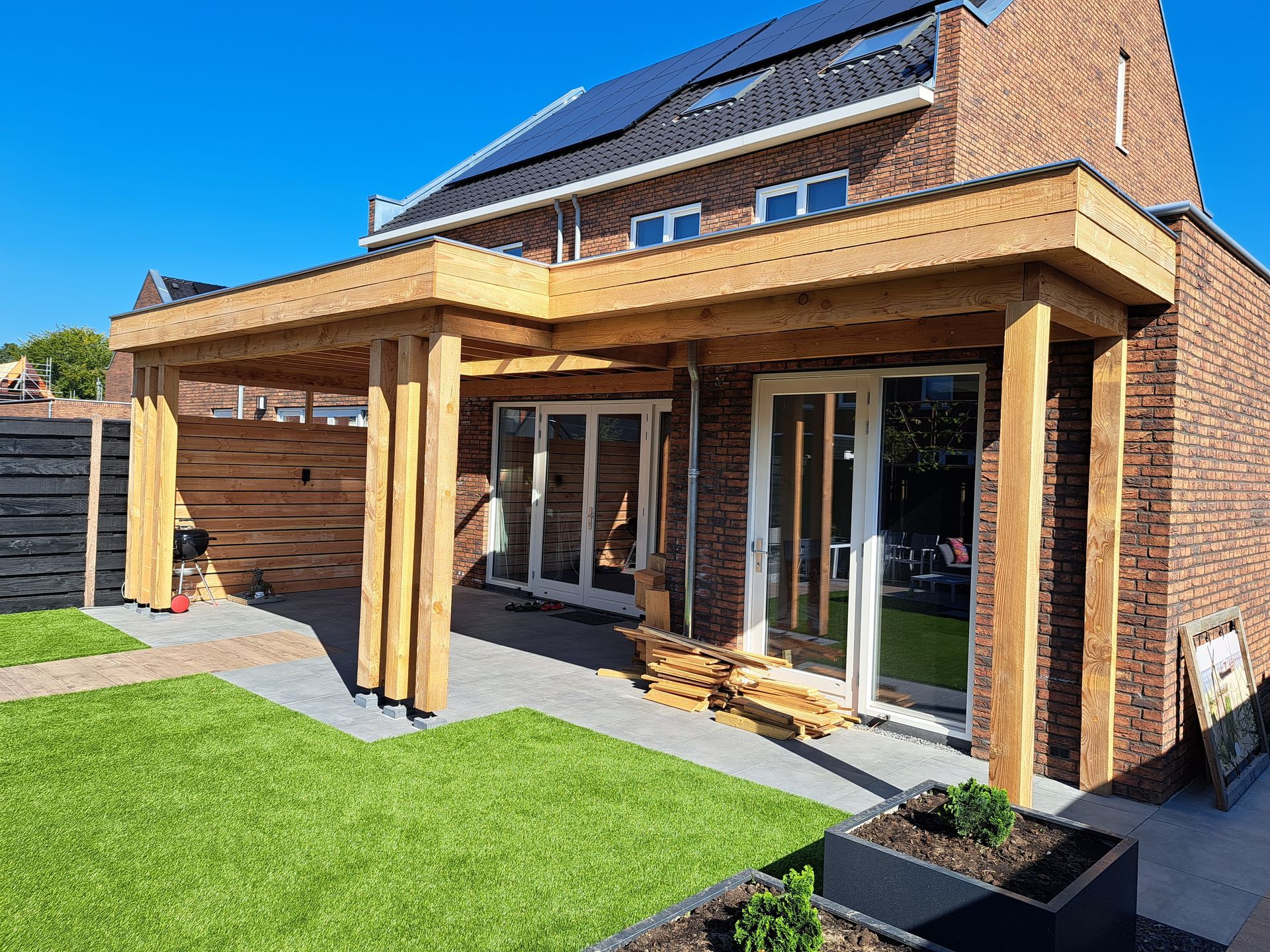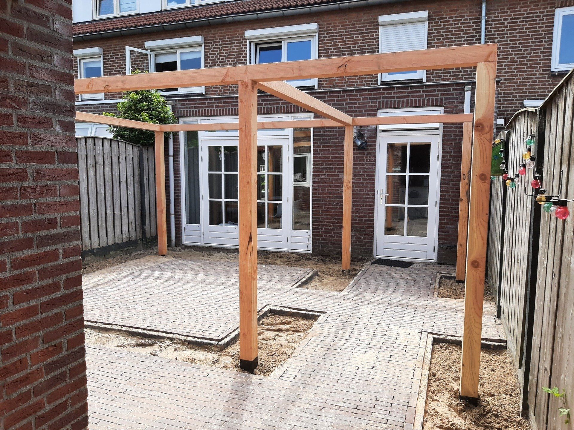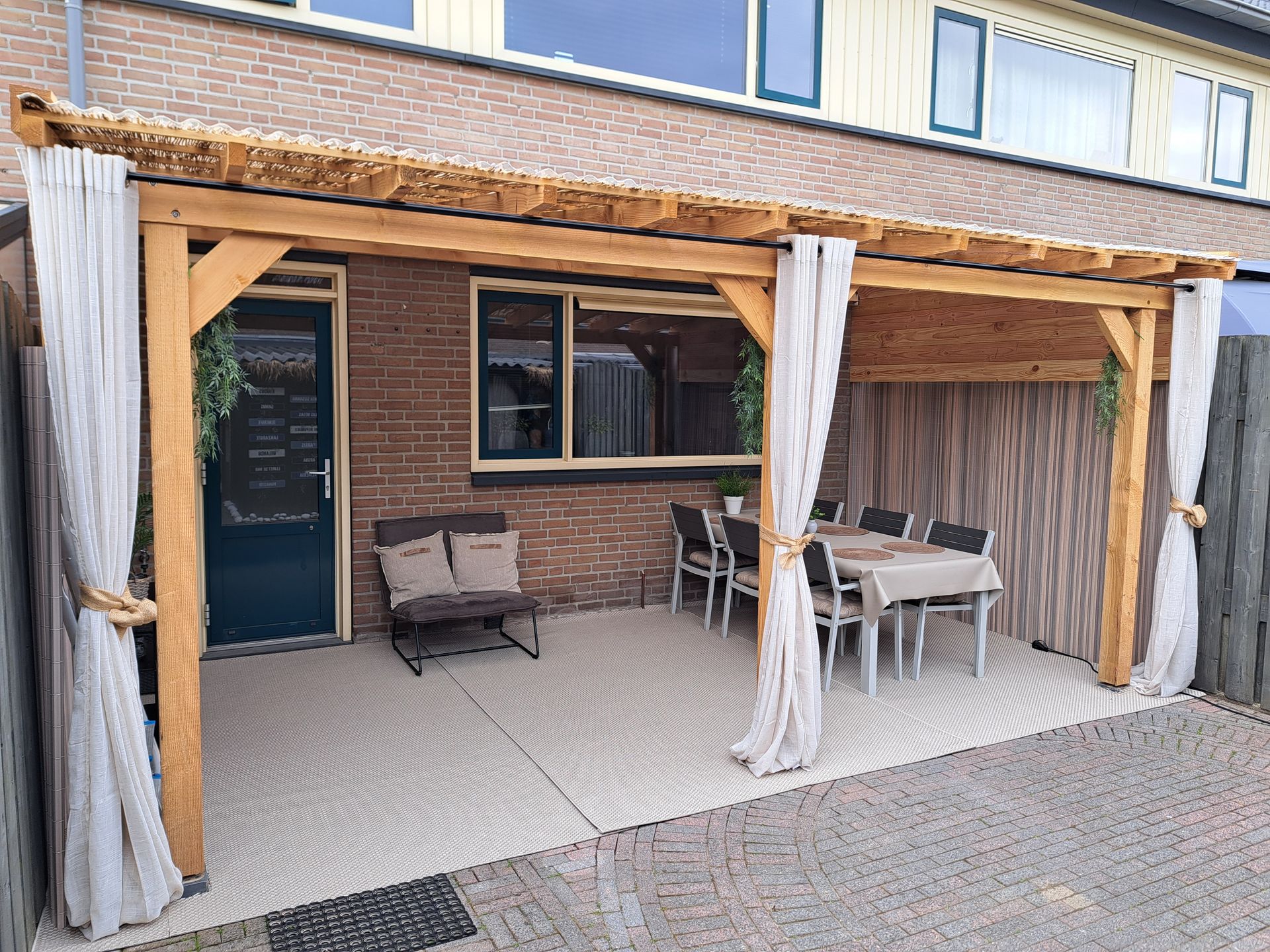 Douglas-houten overkapping met pergola en lichtstraat.