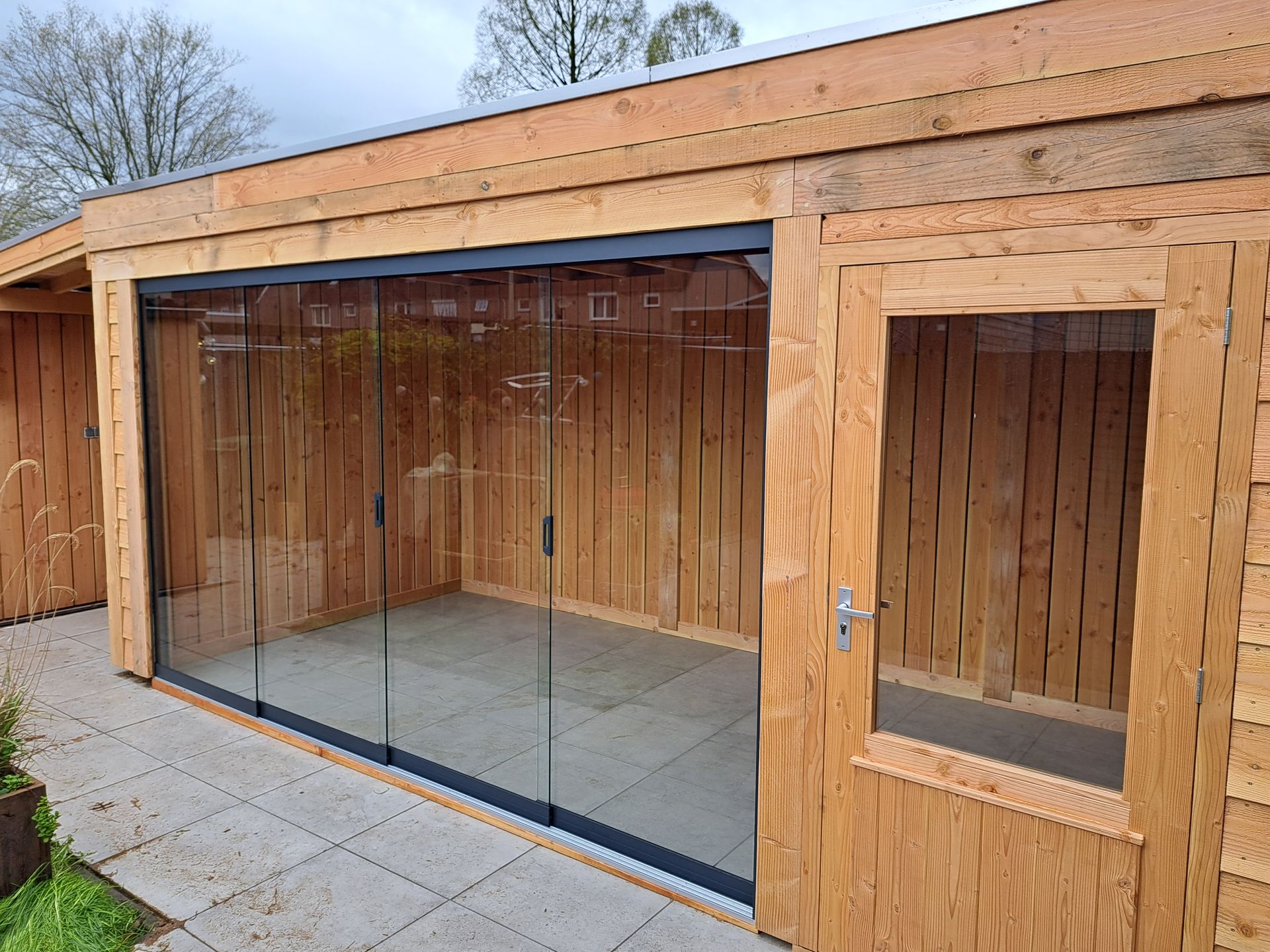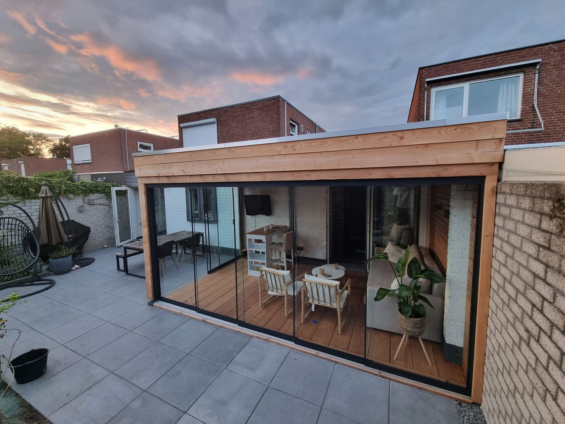 Tuinkamer met glazen schuifwand.