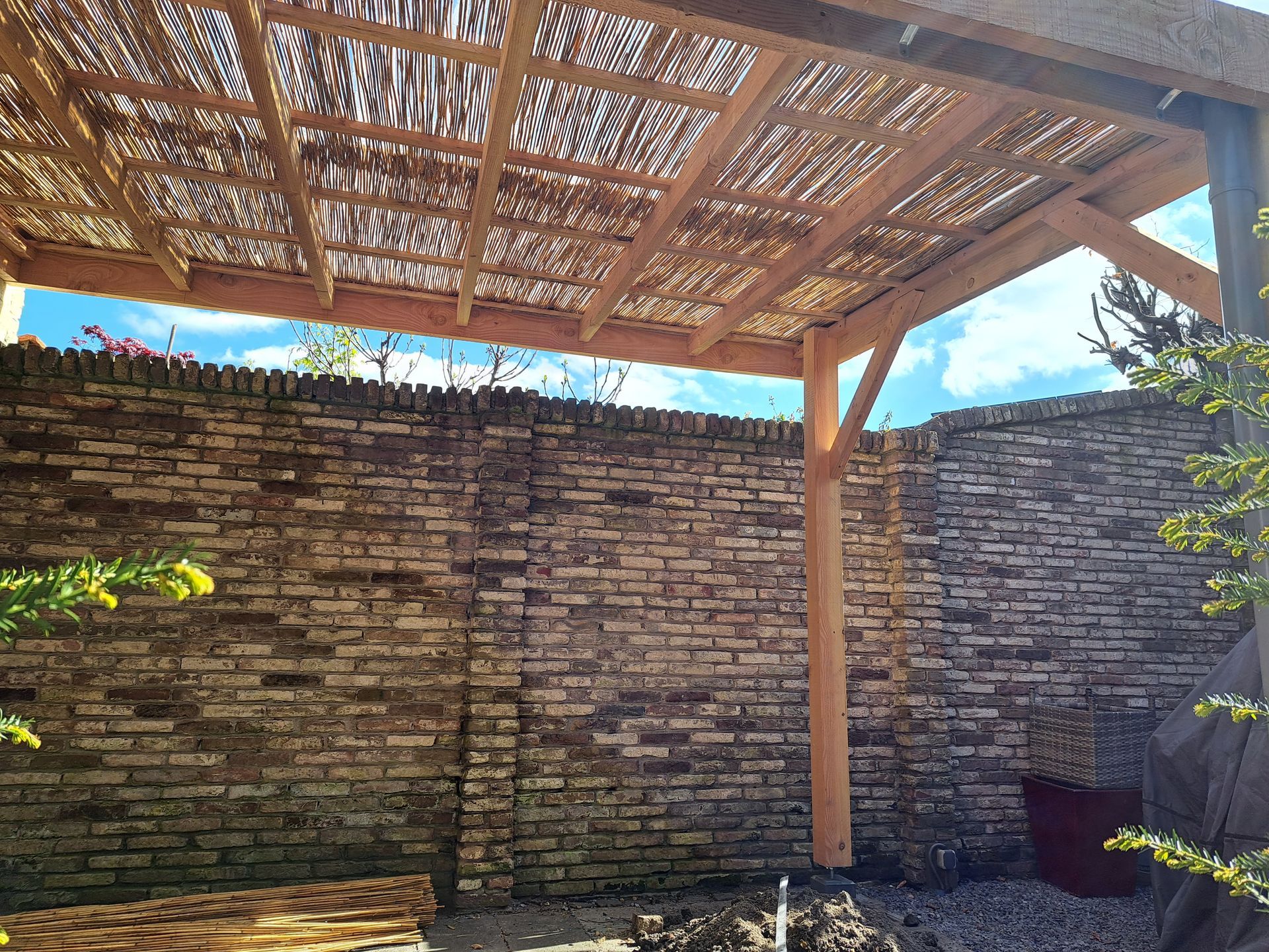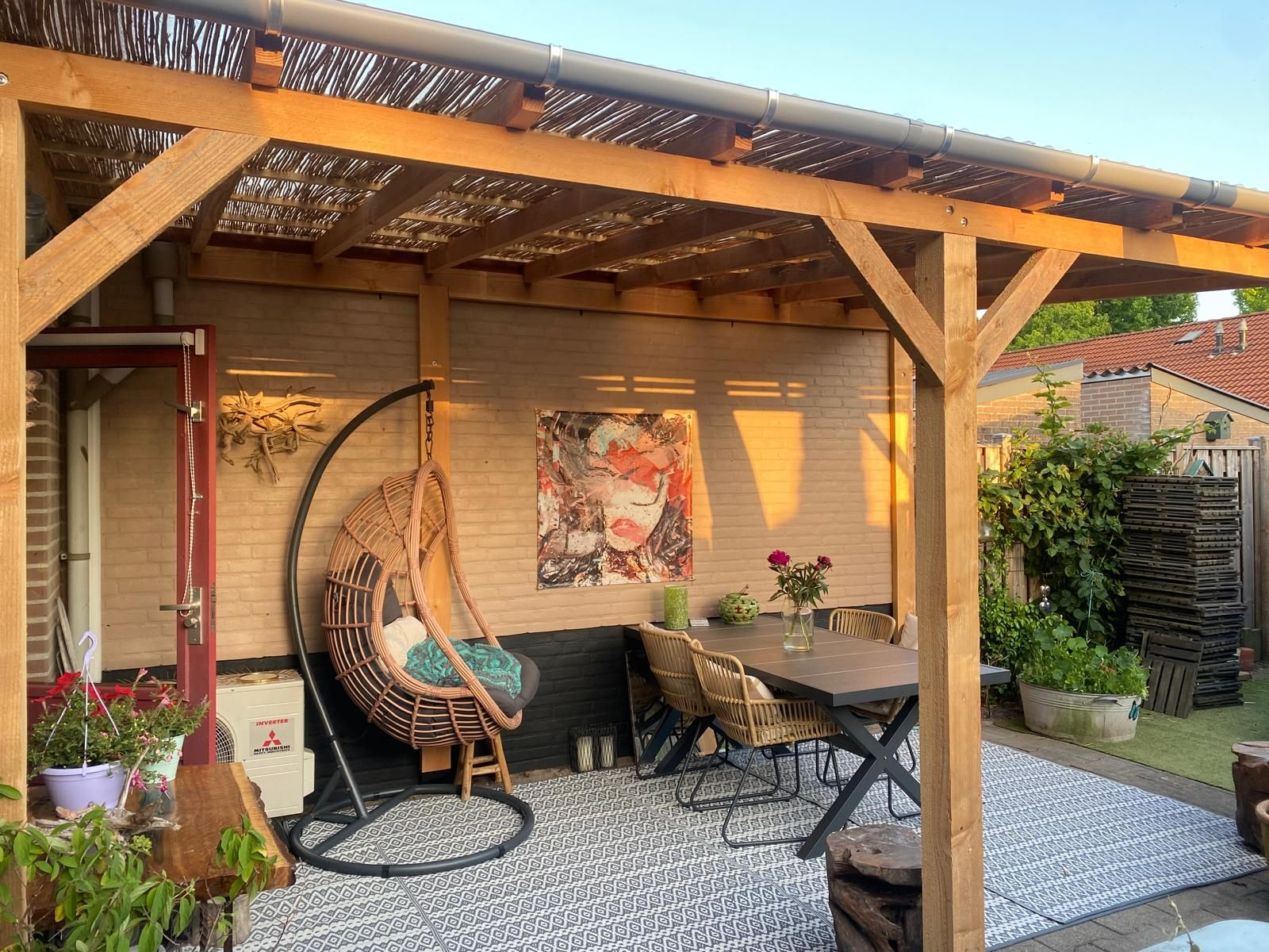 Overkapping van Douglas hout met riet als natuurlijke zonwering. Transparante golfplaat zorgt er voor dat het geheel waterdicht is.