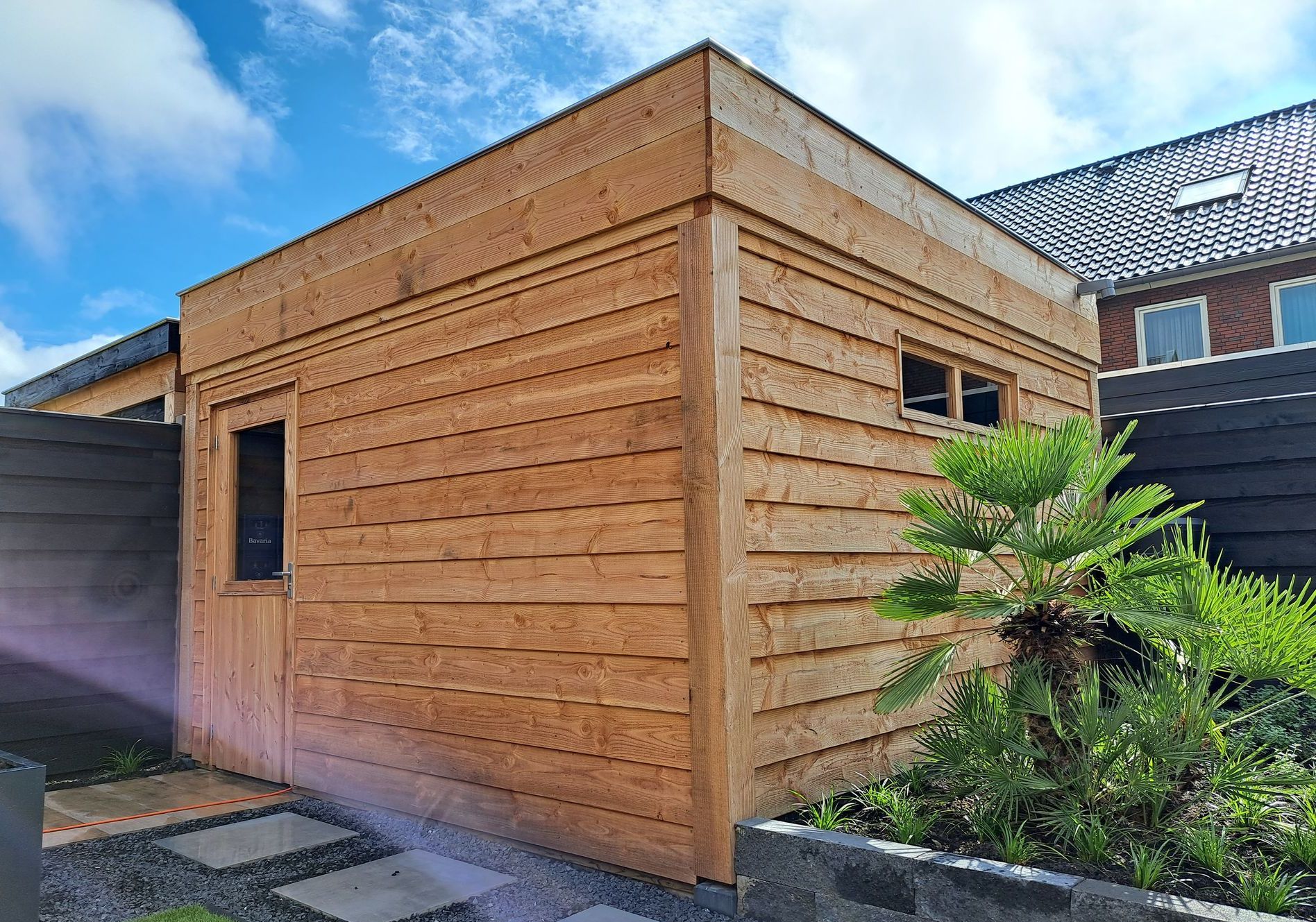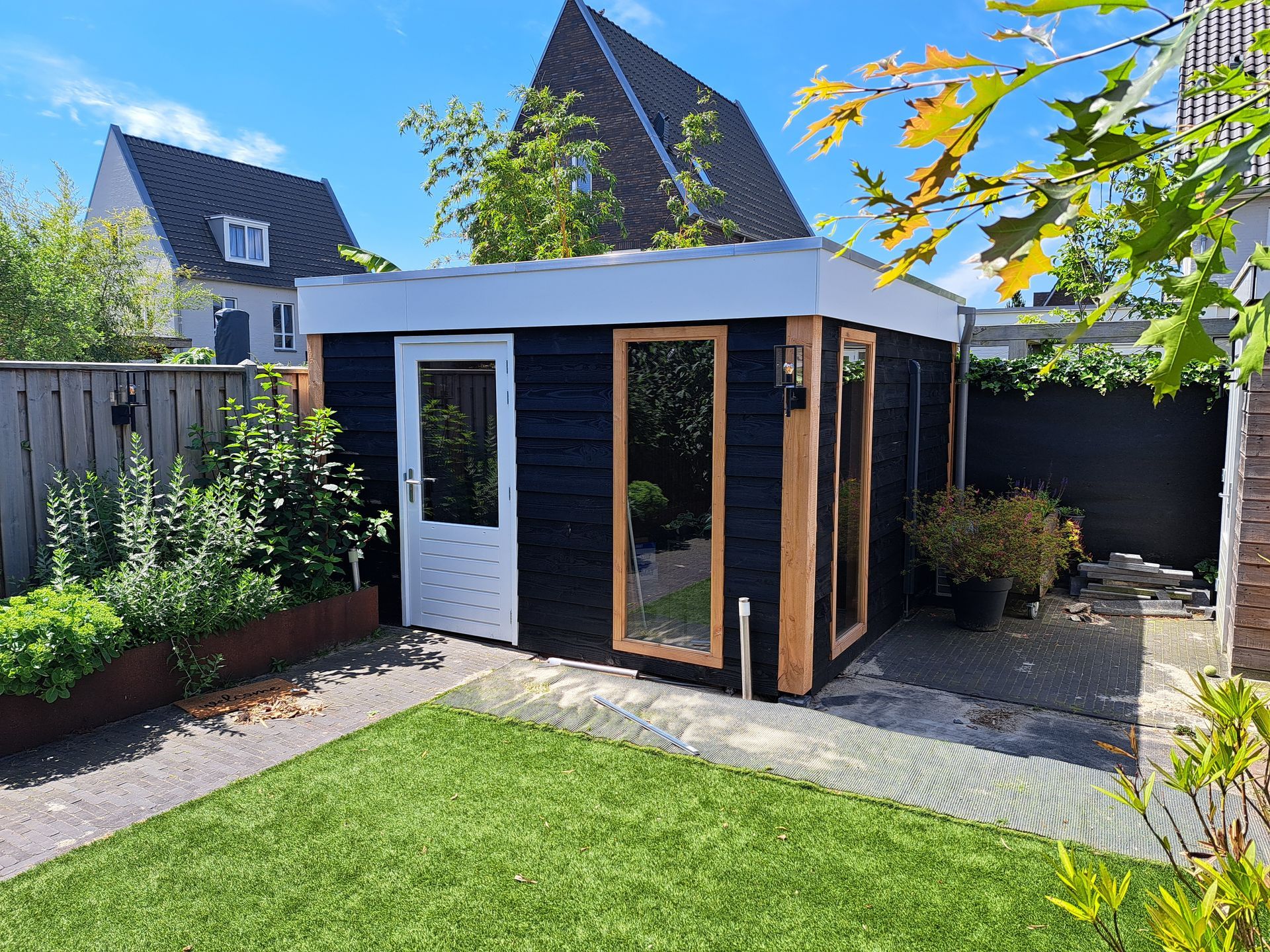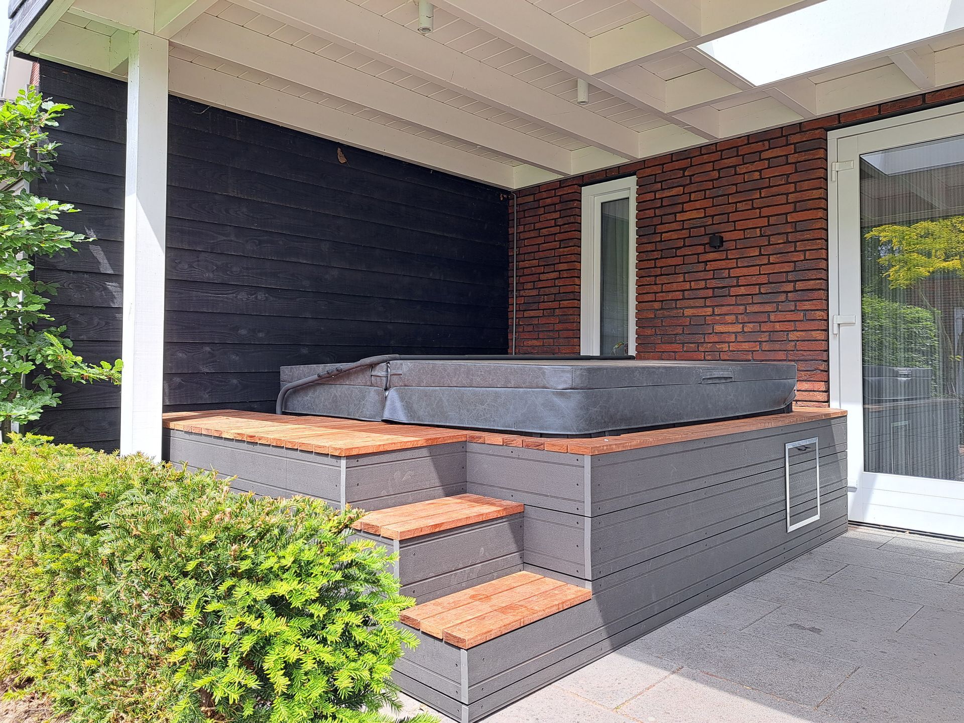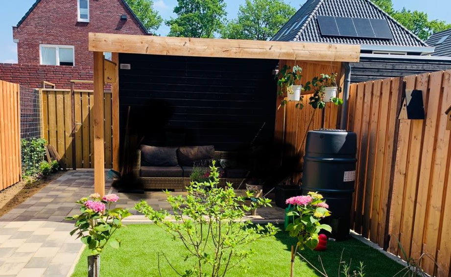 Vijfhoekige overkapping, van binnen afgewerkt met zwart Zweeds rabat. De schutting is al in 2021 gemaakt.