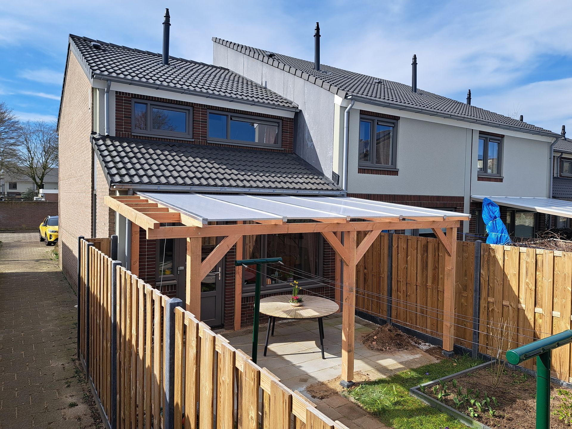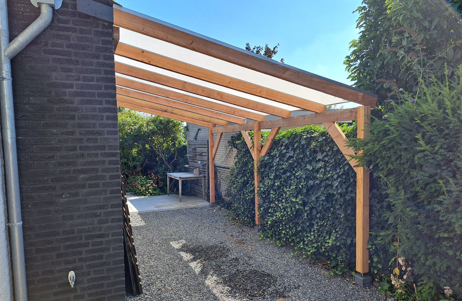 Overkapping met polycarbonaat dakplaten. Ideaal als je geen (direct) zonlicht in je tuin hebt.