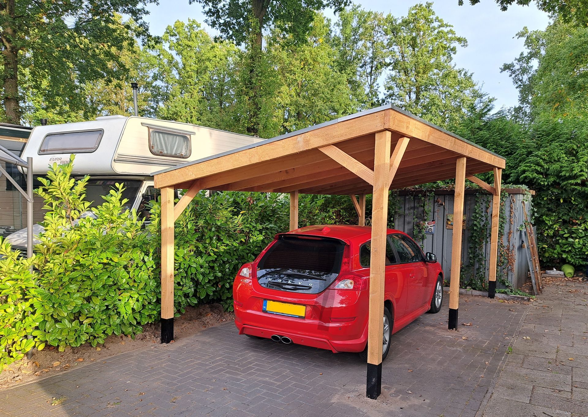 Solide Douglas-houten carport voor de bescherming van je auto tegen vallende takken en eikels.