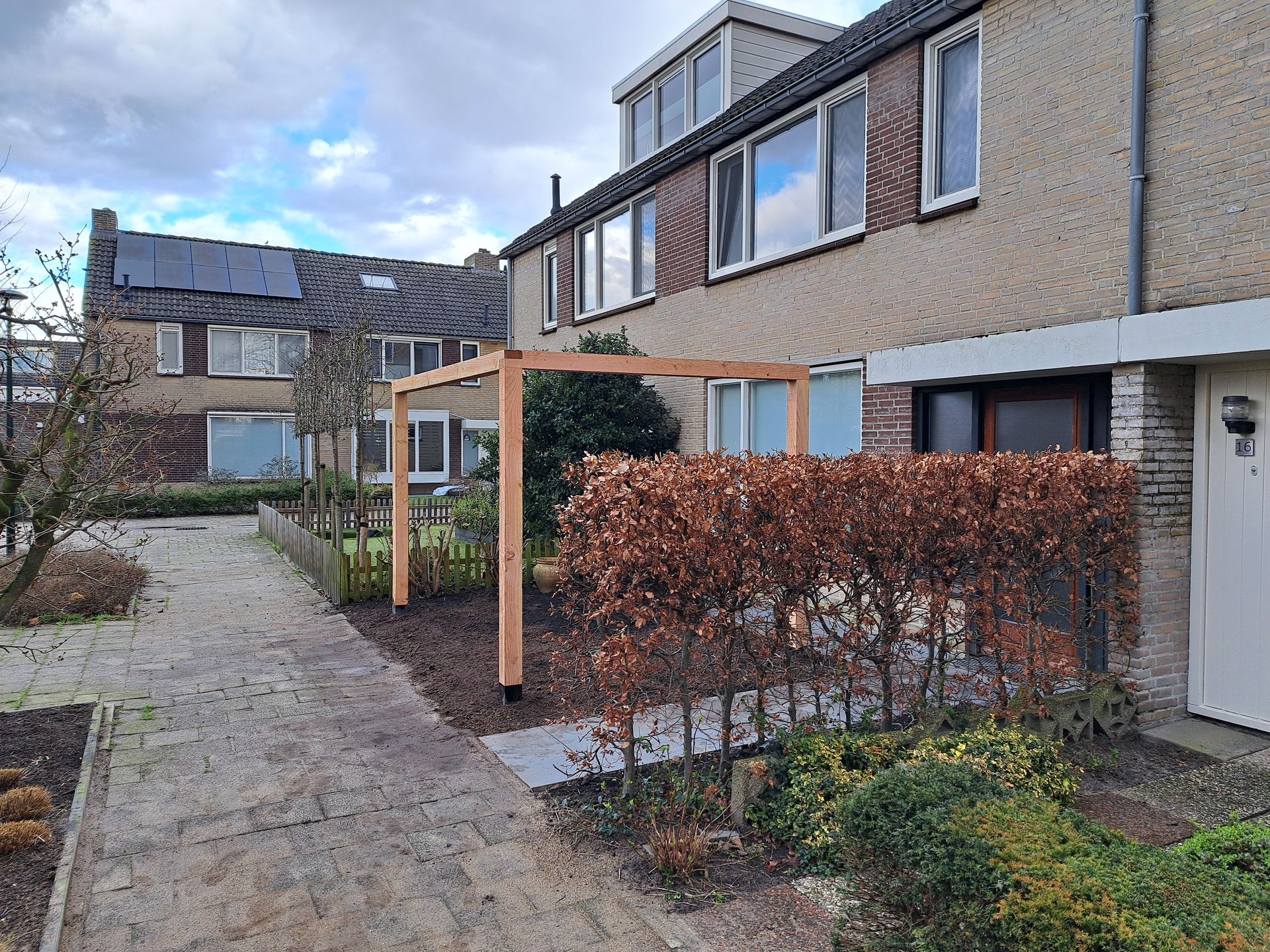 Lage overkapping voor fietsen in de voortuin.