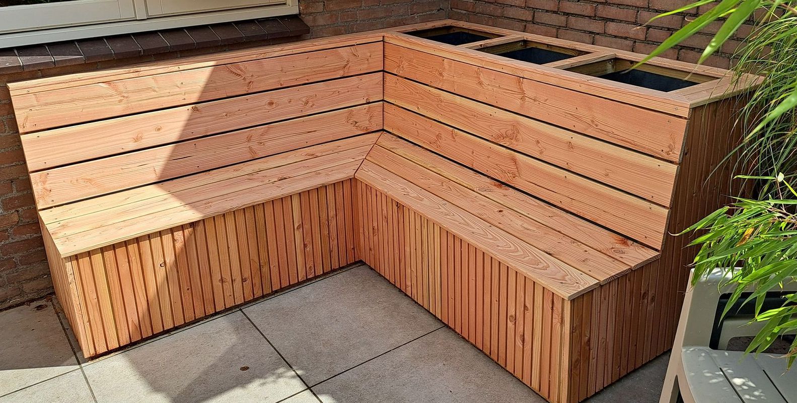 Hoekopstelling vast tuinbankje met ingebouwde plantenbakken. Kussens erin en zitten maar!