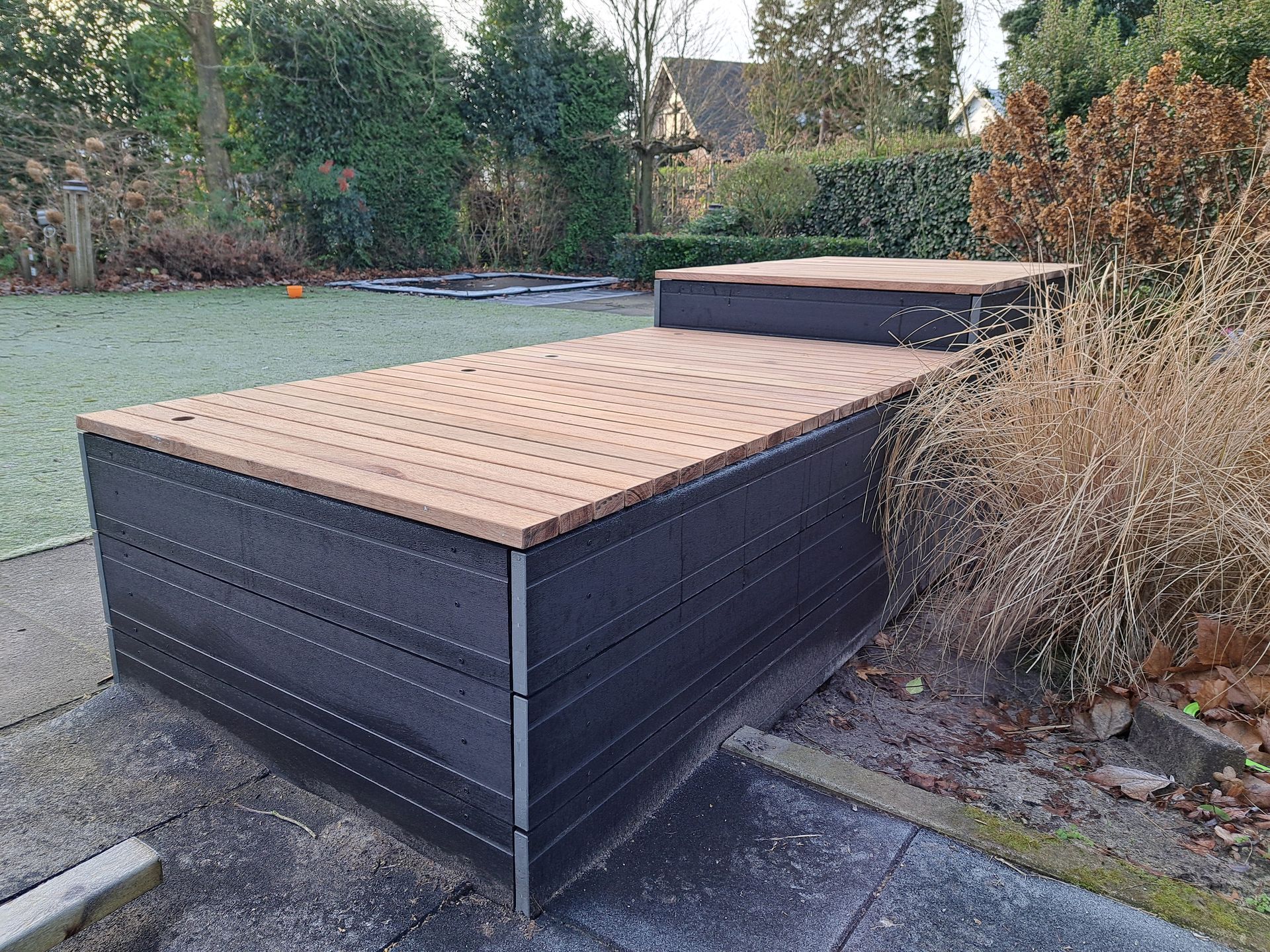Houten ombouw voor een standaard opzetbad, voorzien van trap en plantenbak.