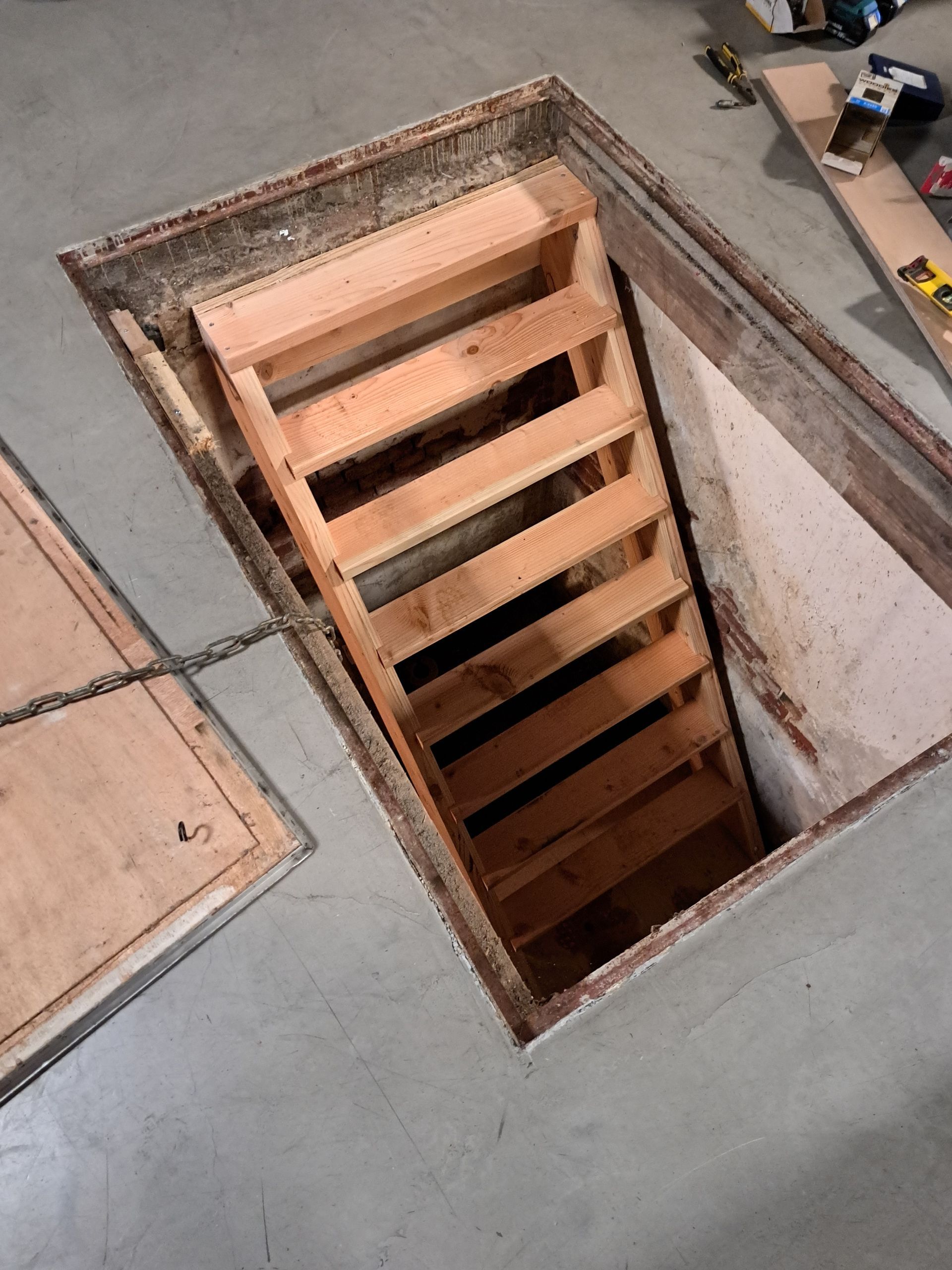 Geen standaard trap mogelijk, dus hebben we er een op maat gemaakt, en geplaatst.