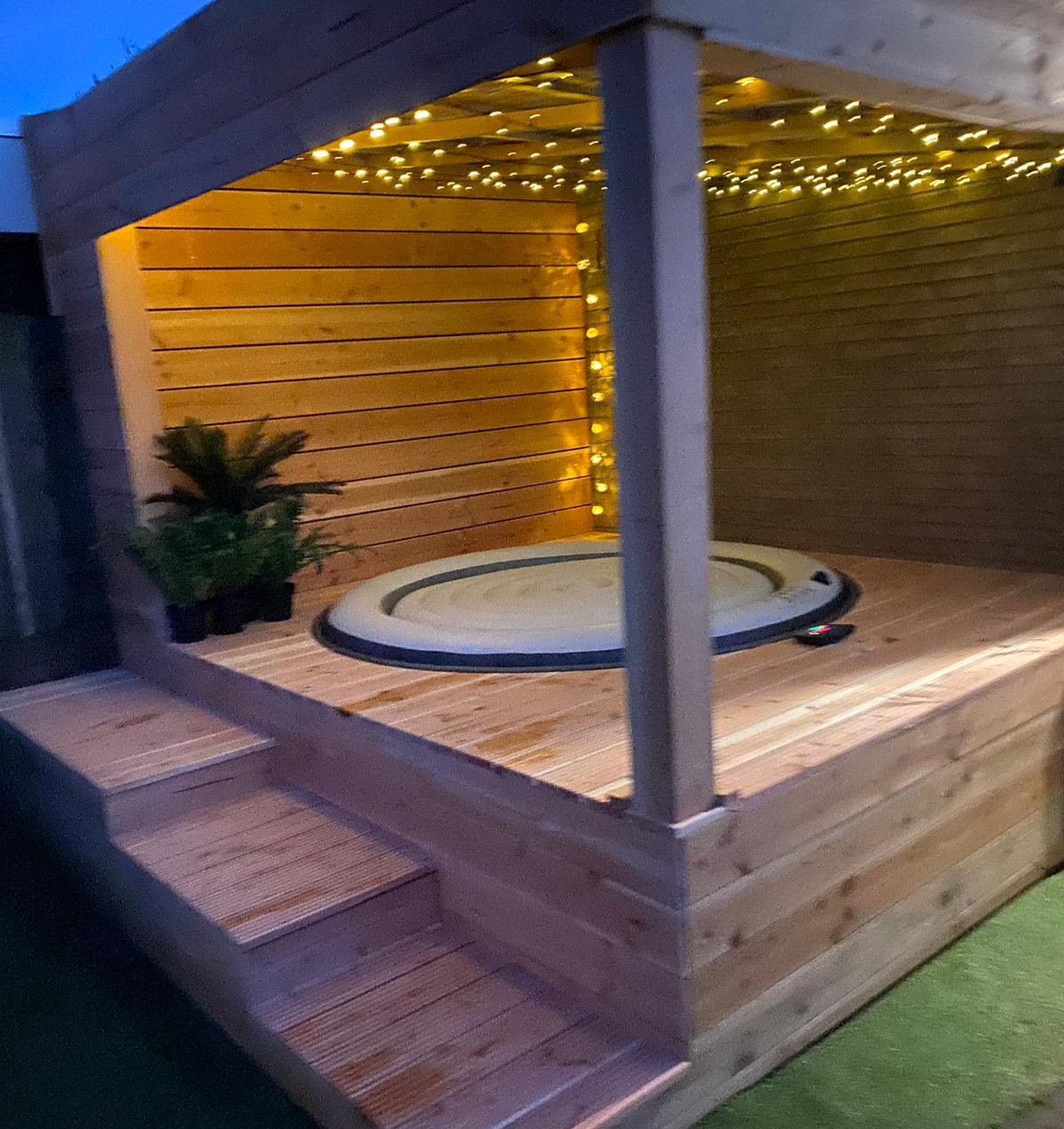 Een op maat gemaakte ombouw en overkapping voor een standaard opblaasbare jacuzzi.