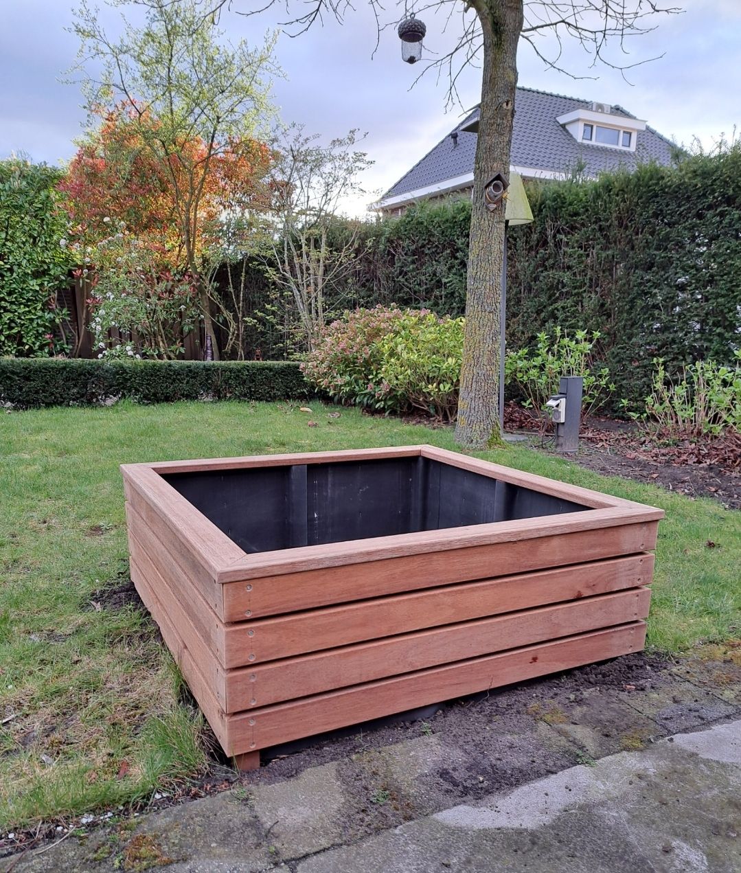 Hardhouten plantenbak van 100 x 100 x 35 cm. Verankert in de grond en voorzien van waterdichte folie aan de binnenkant van de wanden.